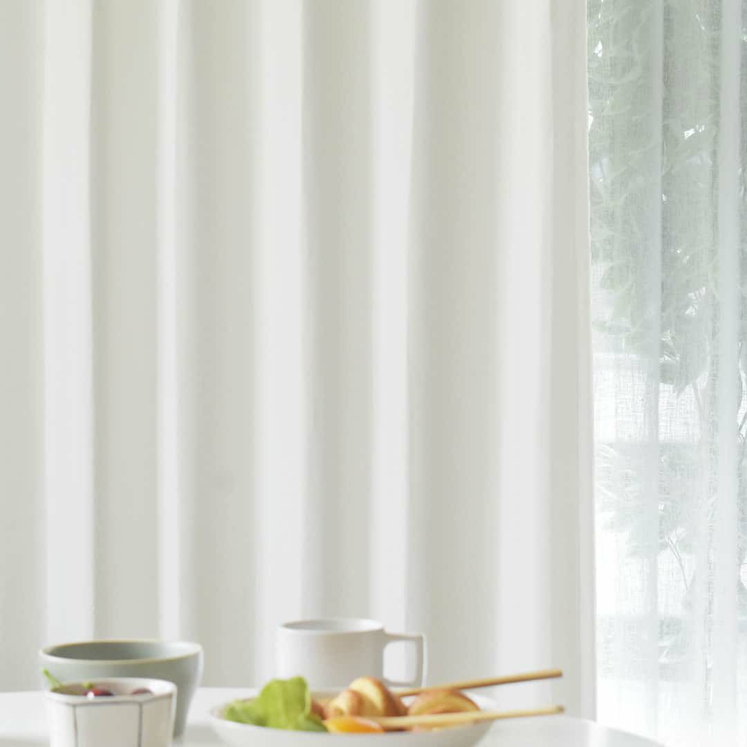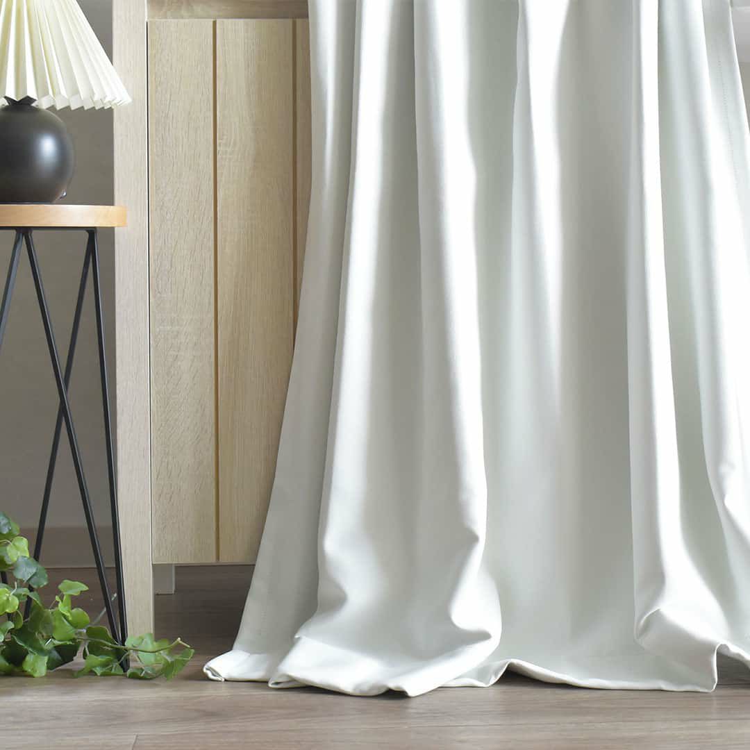 柔らかくもしっかりとした遮光生地です。少し黄みがかったホワイトなのでお部屋に馴染みやすいです。
