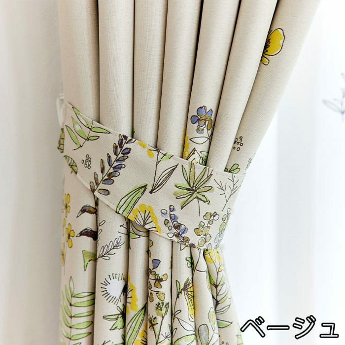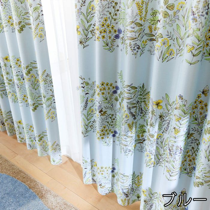 道端に咲く植物や蝶をデザインした2級遮光ドレープカーテン。 近くから見ると、ラフな花々のイラストが可愛いらしく、 遠くから見るとイラストで構成した大きなボーター柄に。 ほっとする優しいタッチのデザインが寝室やリビングに最適です。 ※写真は全て1.5倍ヒダ+形状記憶です。