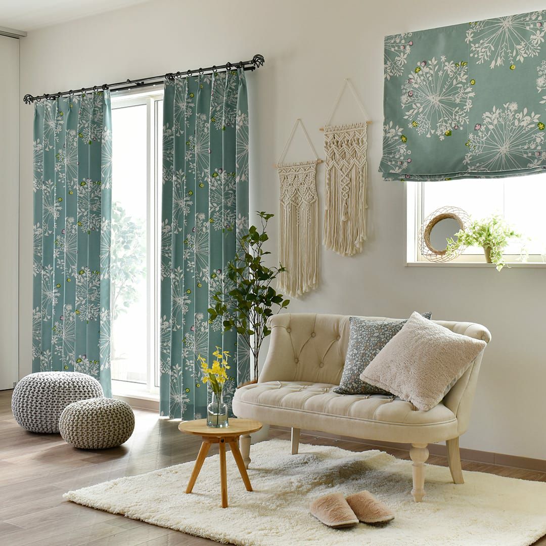 大きくて優しい花束のモチーフがいっぱい。 繊細なボタニカルデザインは、 白木のインテリアや窓に似合います。 ちょっとしたアクセントカラーが効いています。 遮光2級なので眩しい朝日や西日をほどよく遮ってくれますよ。
