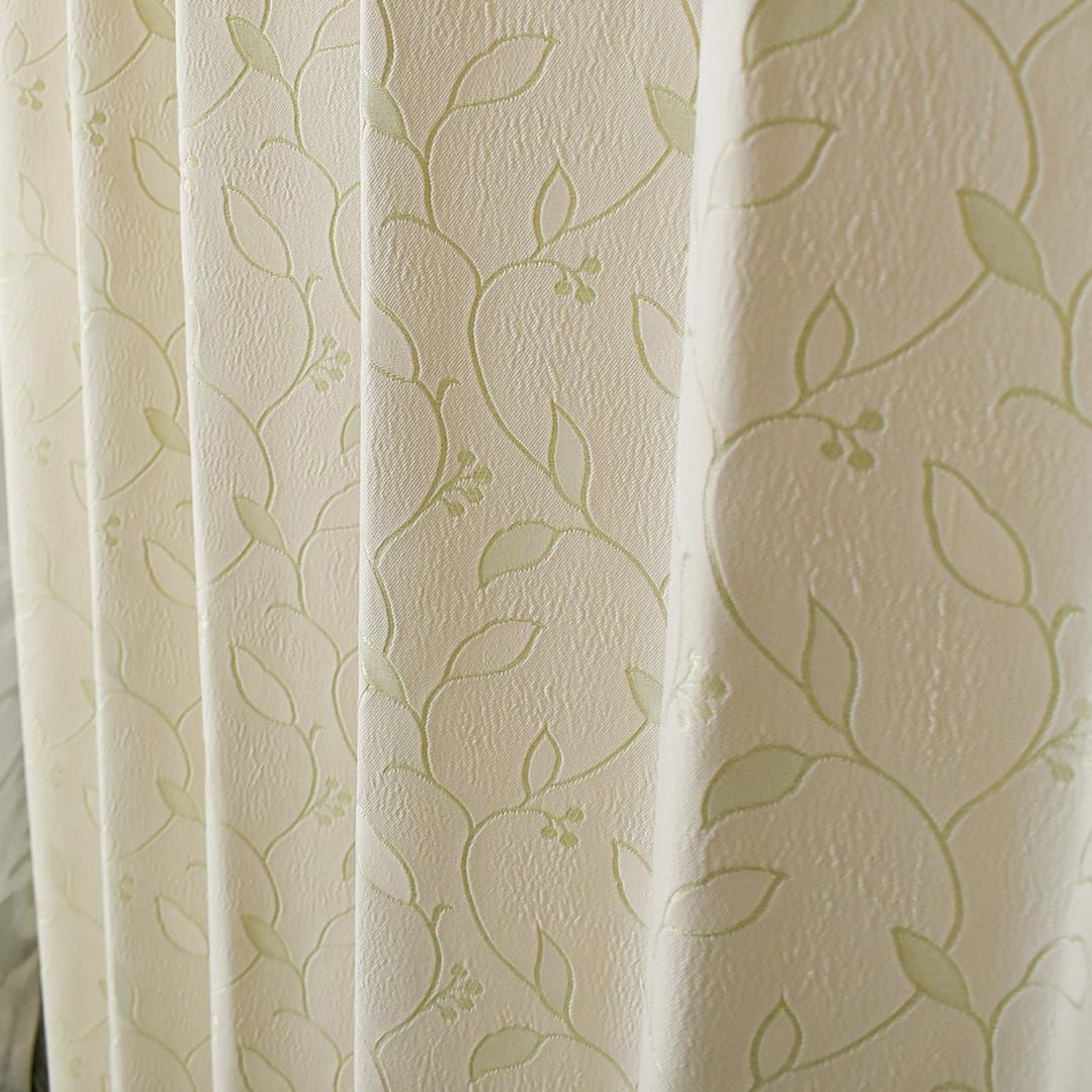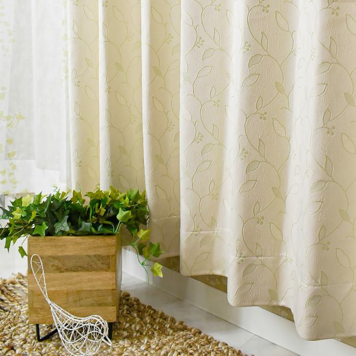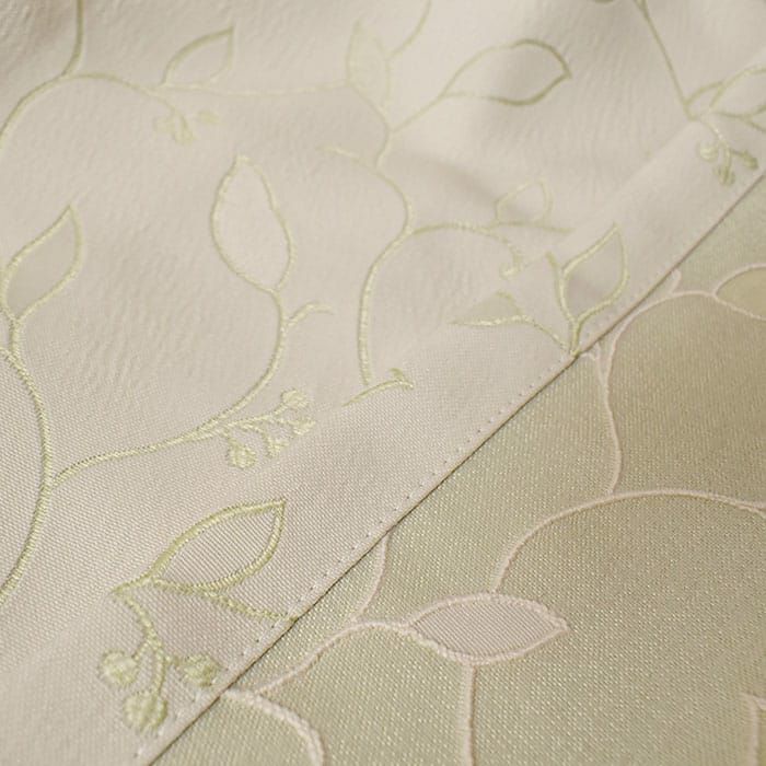 グリーンがかったベージュの生地にグリーンのツタ柄のデザインです。 凹凸があることで日差しを受けた時に優しく浮かび上がります。