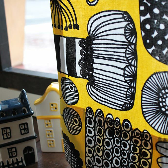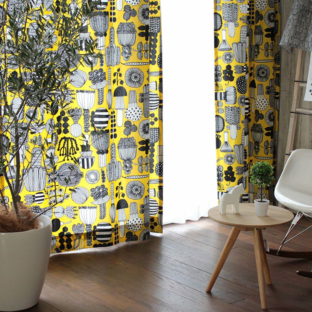 「最高の庭師」を意味するプータルフリン パルハート 庭で育った草花や野菜がいっぱいでワクワクするデザインです。 イエローの生地が北欧らしく、お部屋のアクセントになります。 小柄なので腰窓や小窓におススメです。 デザイナー:マイヤ・ロウエカリ