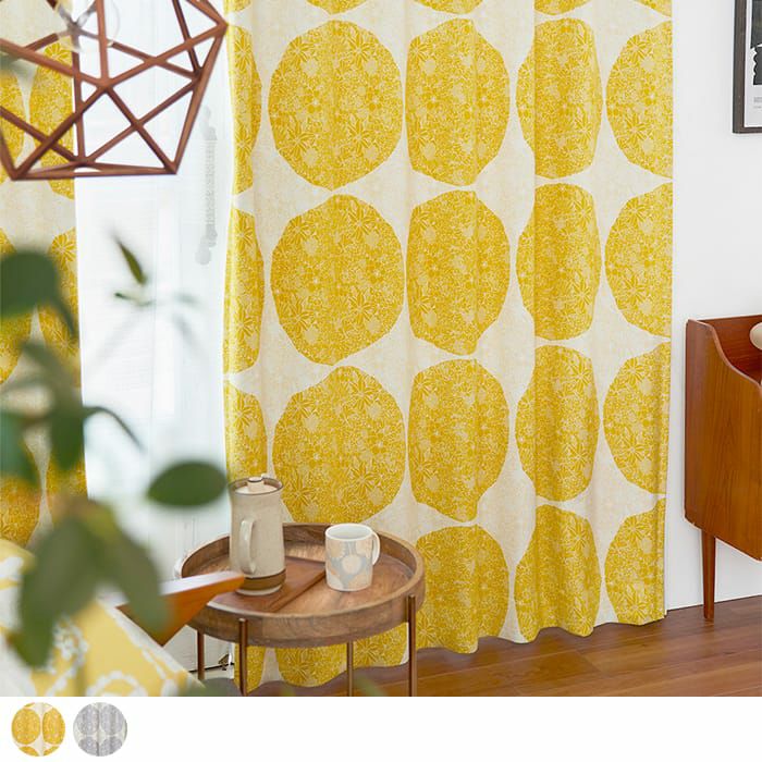 生地全体に描かれた植物の上に、大きなドット柄を重ね合わせたデザイン。 手描きのいびつな植物のラインが温かい印象に。 ところどころに咲くたくさんの花柄が見どころ。 イエローは温かみがあり、グレーはお部屋を落ち着いた雰囲気にします。