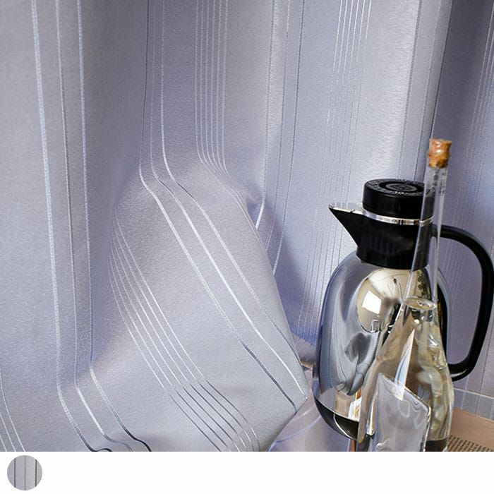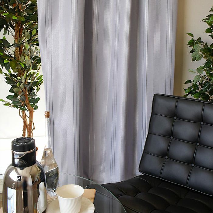 高級感のある光沢の生地のカーテンです。 さりげなく縦に入ったシルバーのラインが角度によってきらきら光ります! 3級遮光で強い日差しを和らげ、光も取り入れてくれます。