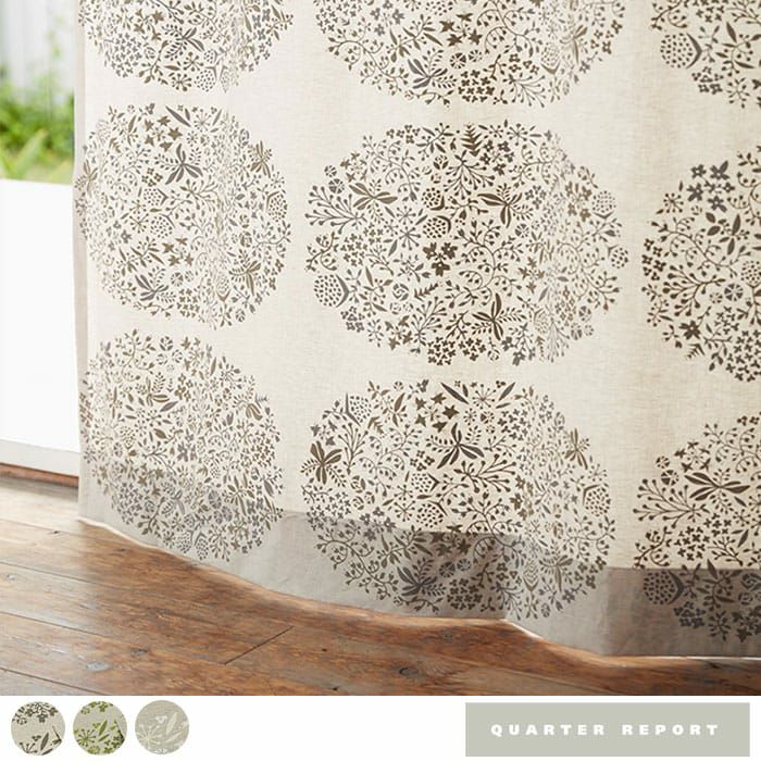 ナチュラルな北欧プリントカーテン アパレルブランド「Ugai」を主宰する鵜飼甘菜さんのデザイン。 綿と麻の混紡糸を使った生成りの生地に顔料プリントをしています。 草木のモチーフで大きなサークルを描いた北欧ナチュラルカーテン。