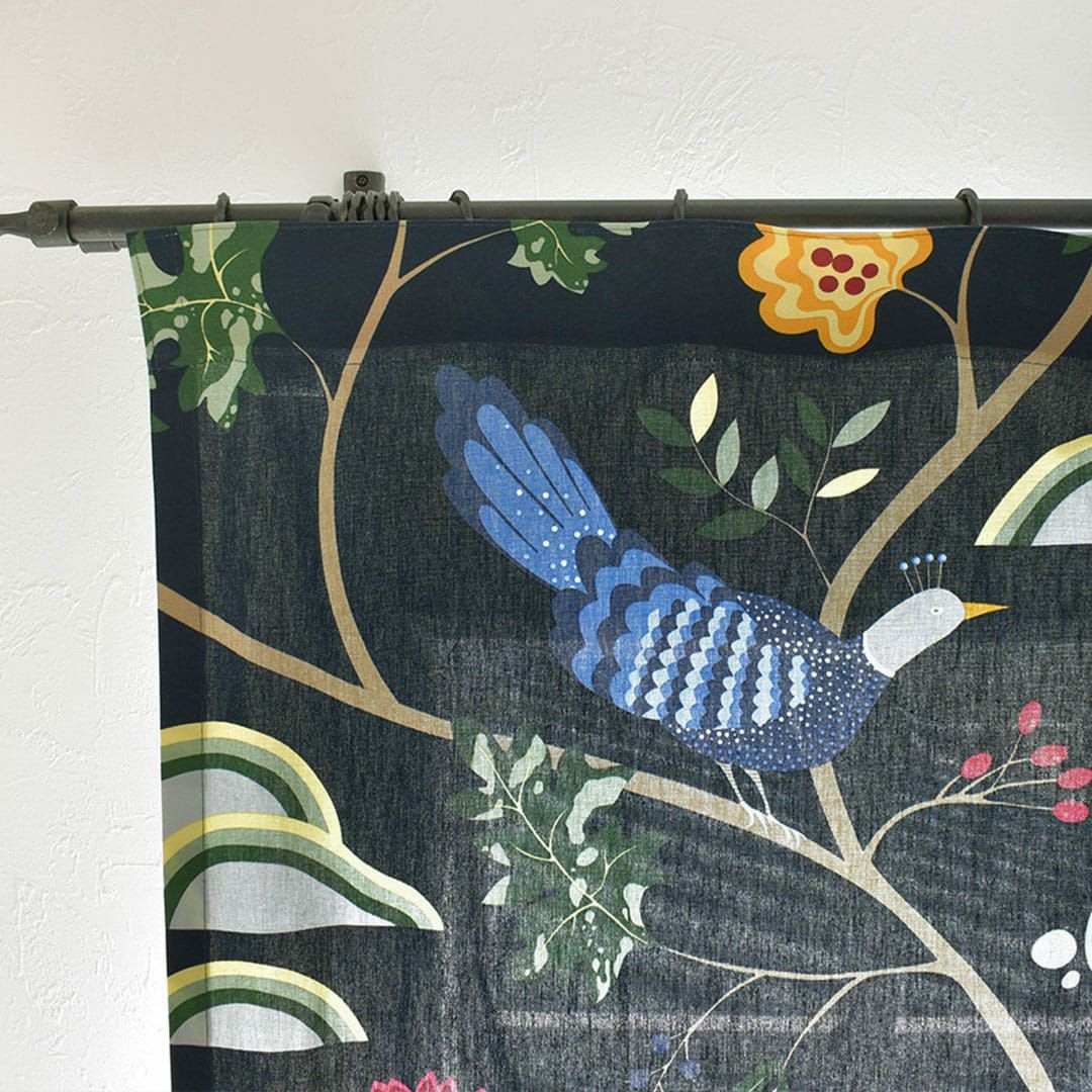 大きな鳥がすむ森のプリント柄。華やかでストーリー性のあるデザイン。 色鮮やかな幸せの青い鳥が存在感抜群です♪ 落ち着いた色合いなのでインテリアとも馴染みます。