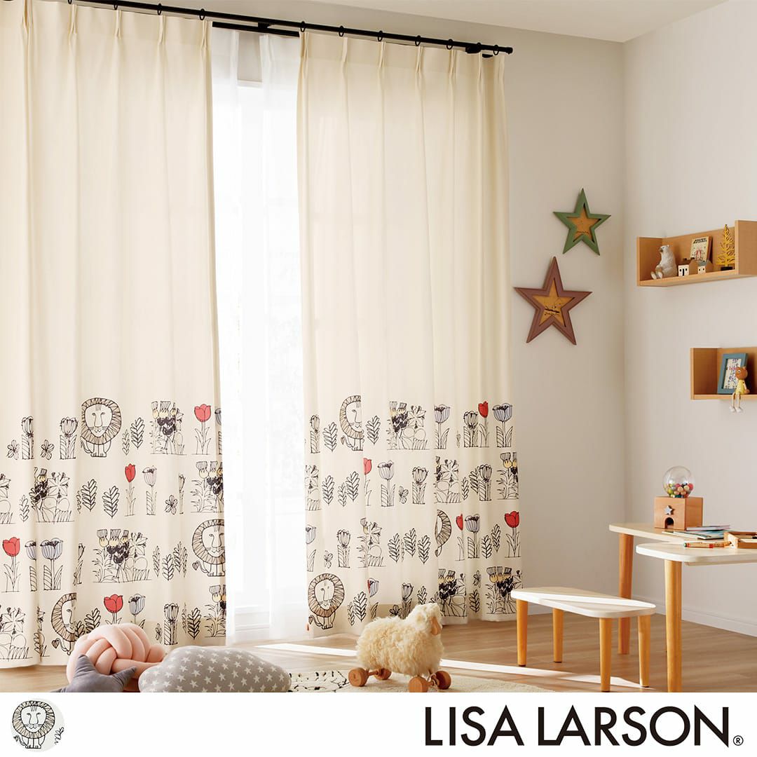 北欧カーテン「リサ・ラーソン」シリーズ さまざまなお花に囲まれた、ころんとしたフォルムで愛嬌たっぷりな"ライオン" 綿素材が醸し出すナチュラルな風合いと上質な質感も魅力的です