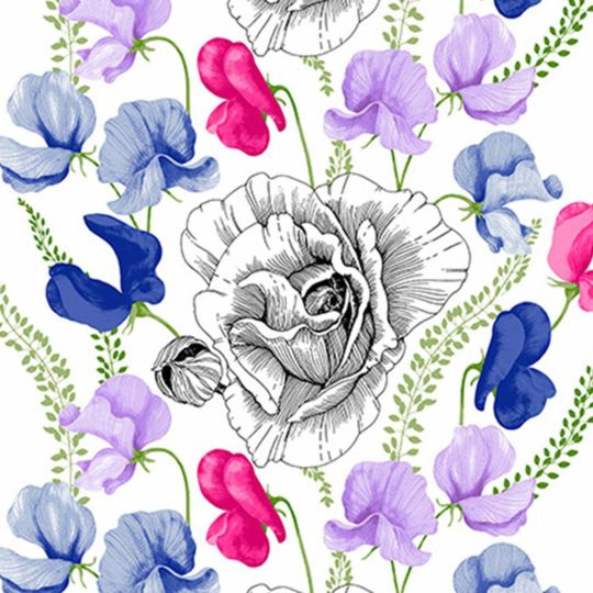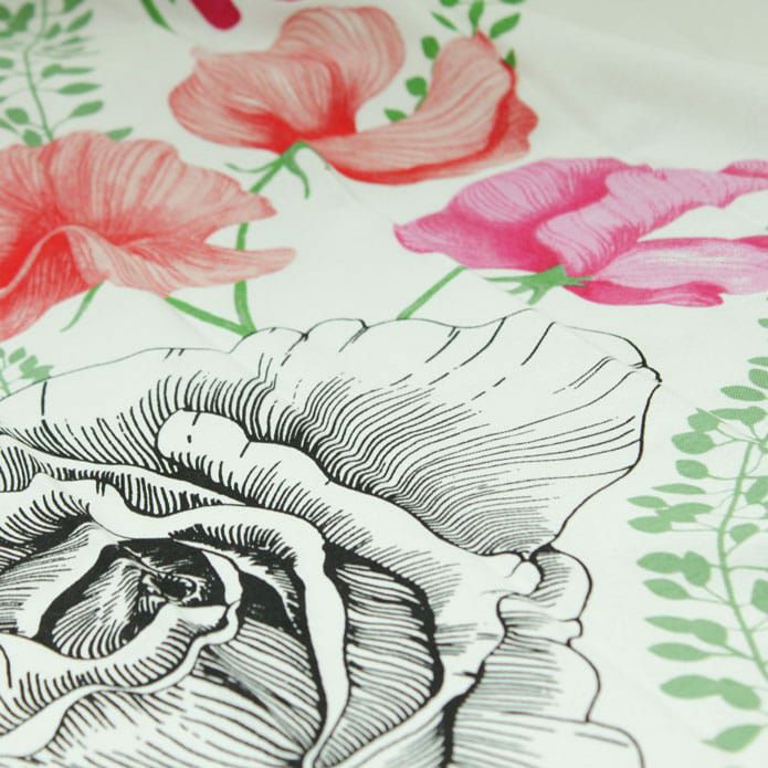 ブルーとピンクのコントラストが鮮やかな 大胆な花柄が美しい「カイノ」。 大きな一輪の花の周りに色とりどりの花々が描かれています。 上品で洗練されたスタイリッシュなデザインです。