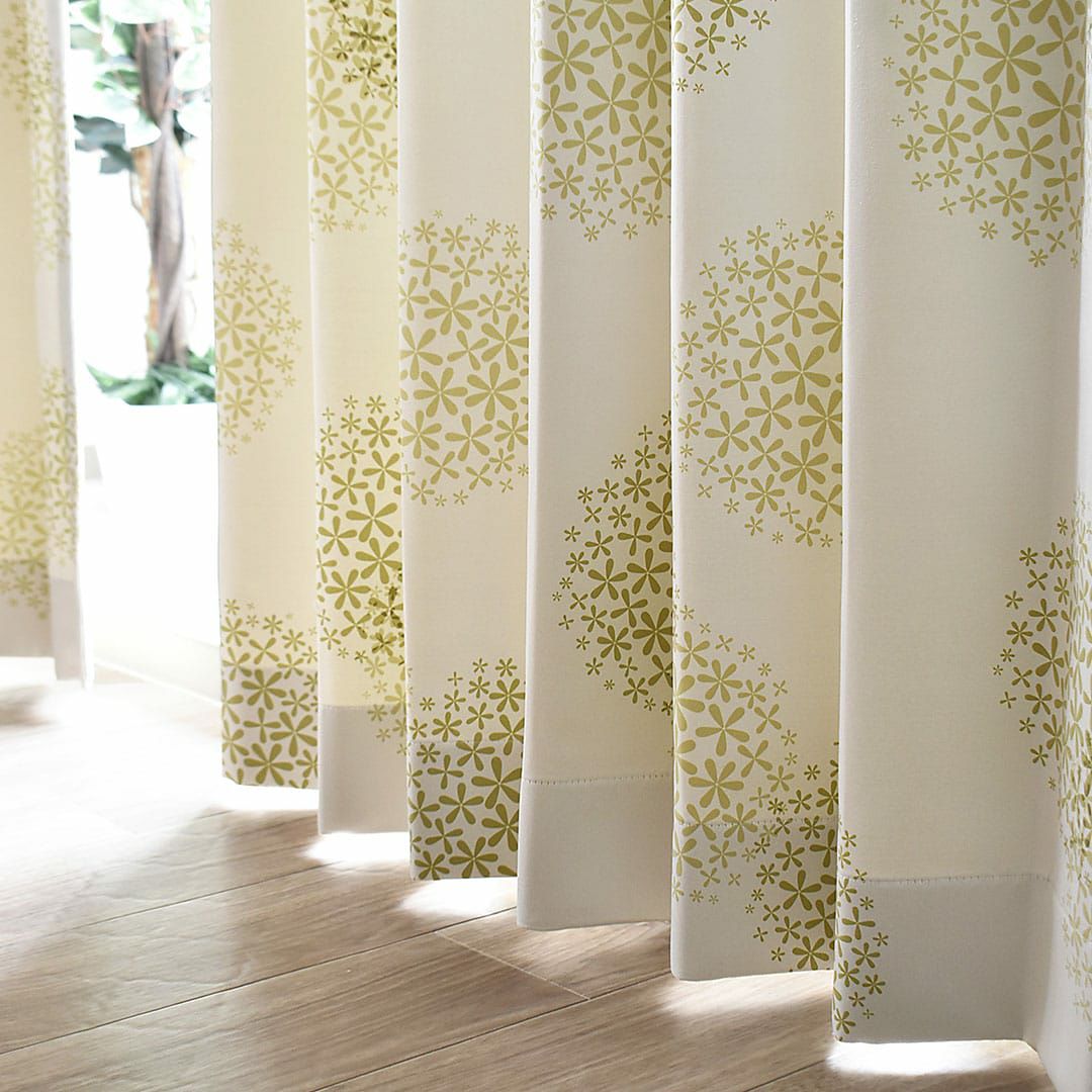 ▲グリーン 少し黄みがかった生地にイエローグリーンのお花プリントでお部屋を優しく明るい雰囲気にしてくれます。淡いナチュラルテイストのインテリアによく合います。