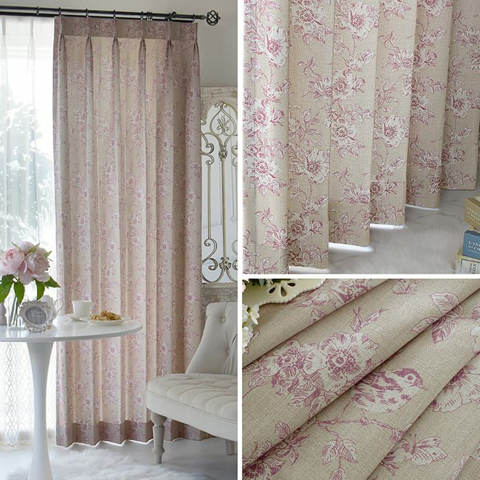 くすみピンクにグレージュの小鳥柄×お花刺繍を合わせました。 どちらも落ち着いた雰囲気で、大人かわいいお部屋に。 透明感があるので、外の景色も合わせて楽しめます♪