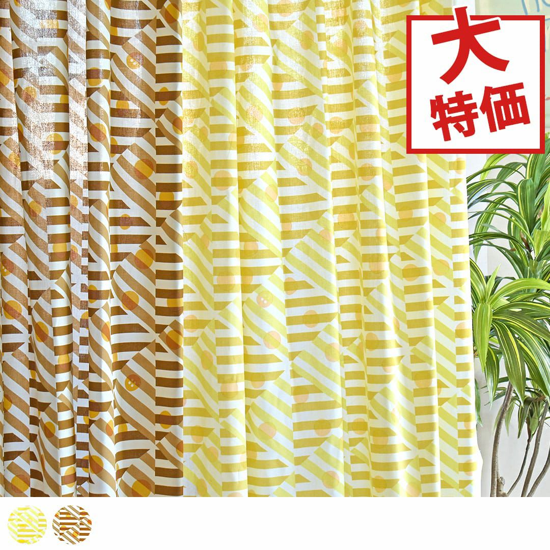 大特価でご提供! トライアングルボーダー&ドット柄の ポップなデザインコットンカーテン