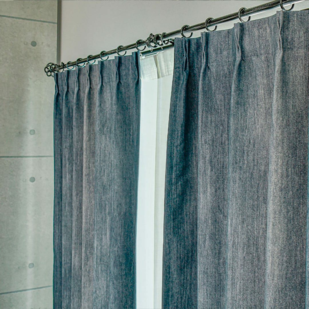 (使用アイテム:レース ZARA、クッションカバー ベネット(ブルー)、タッセル:非売品) ▲写真は全て1.5倍ヒダです。 ジーンズでよく見られるかすれを表現しユーズド感がある仕上がりに。 デニムじゃないのにデニムのような重すぎず味わい深いカーテンです。 また、2級遮光なので程よく光を取り込んでくれます。
