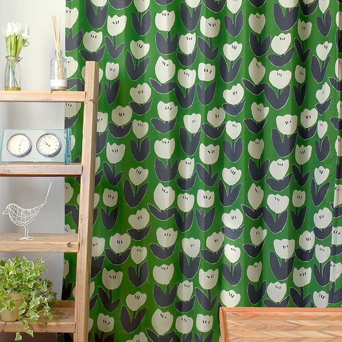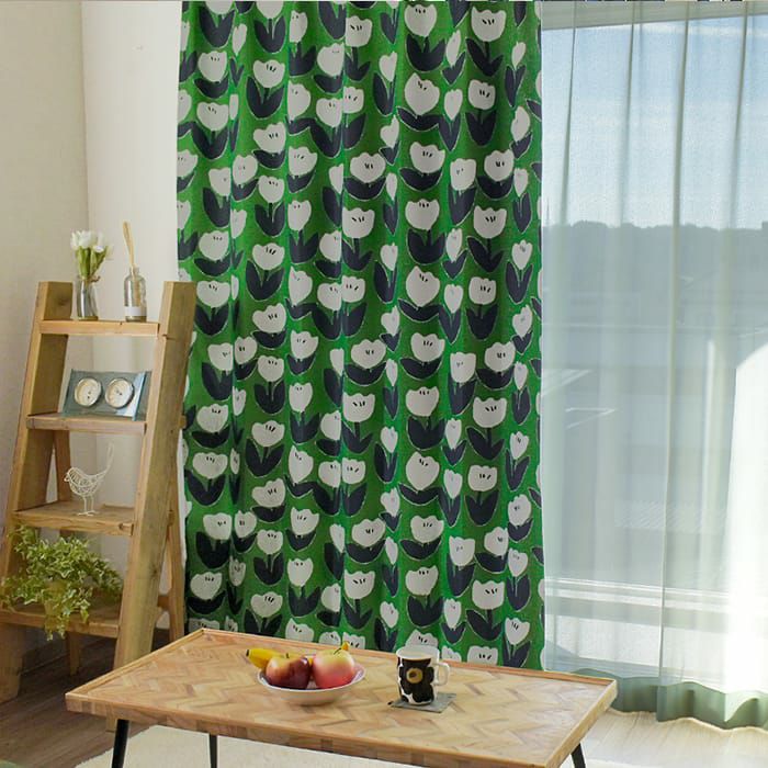 草原のようなグリーンのカーテンに、白いチューリップがお花畑のように一面に咲いたカーテン。 お部屋がレトロでかわいらしい雰囲気に大変身します。 木目調の家具に馴染みます。