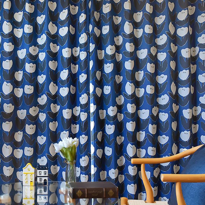 深いブルーのカーテンに、白いチューリップがお花畑のように一面に咲いたカーテン。