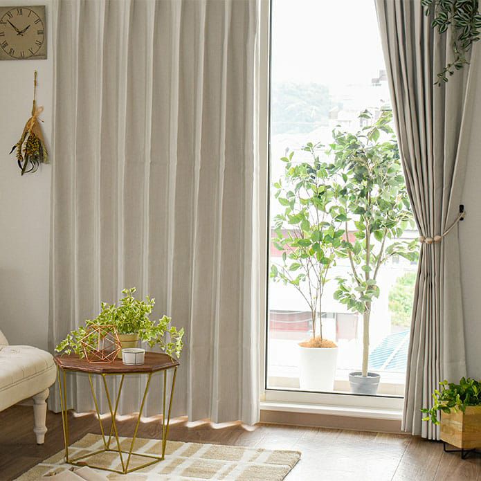 サイズが大きくなると幅継ぎをしなければならない通常のカーテンに変わって 横方向に生地を使ってカーテンを作るので継ぎ目や光漏れがありません! 白よりもやわらかい印象のアイボリーはお部屋全体をやさしくなじませてくれます。 女性らしい和やかな窓周りになりますよ。