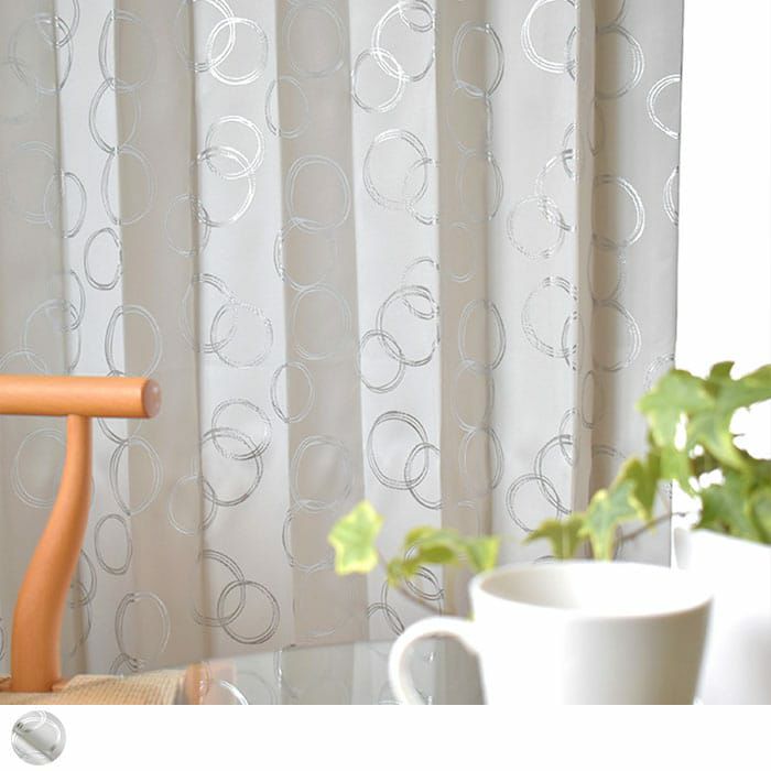 白地にシルバーのラメプリントのモダンカーテン お部屋の照明の角度によってサークル柄が光になったり影になったり いろいろな表情が楽しめる完全遮光カーテンです。 しかも樹脂コーティングで光をシャットアウトします。 遮熱、保温で冷暖房効果もアップ!防音効果もプラス。