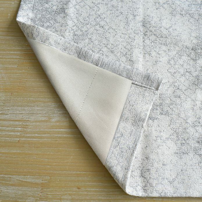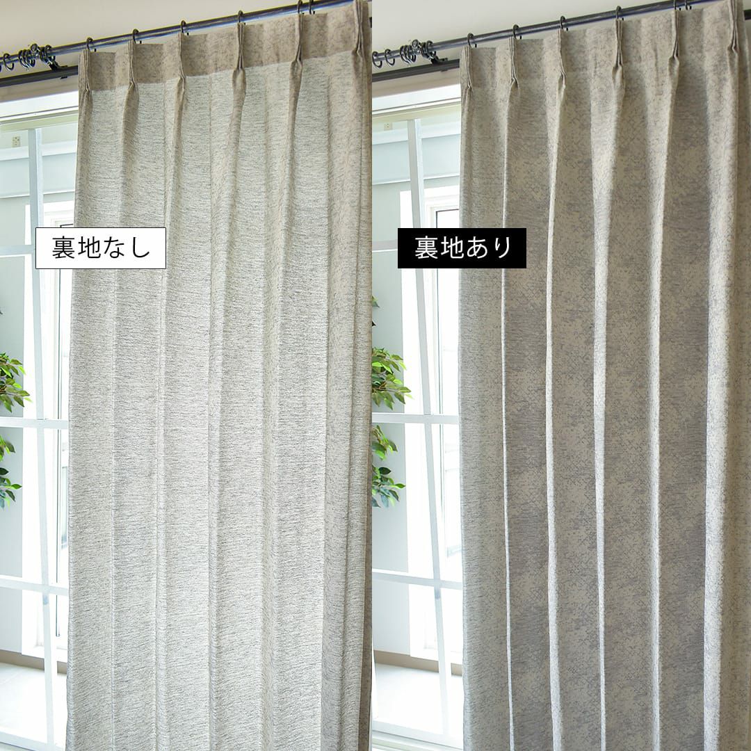 天然繊維の素材を使っている生地や、鮮やかなプリント柄を表現している生地は、比較的薄く仕上げているものが多いので、カーテンになると軽やかです。 裏地カーテンは遮光糸が織り込んでいるため、天然繊維の生地より重く仕上がります。その2つの生地を組み合わせているため、カーテン全体に重みがプラスされ、レールに下げた時の裾周りがストンと落ち着きます。