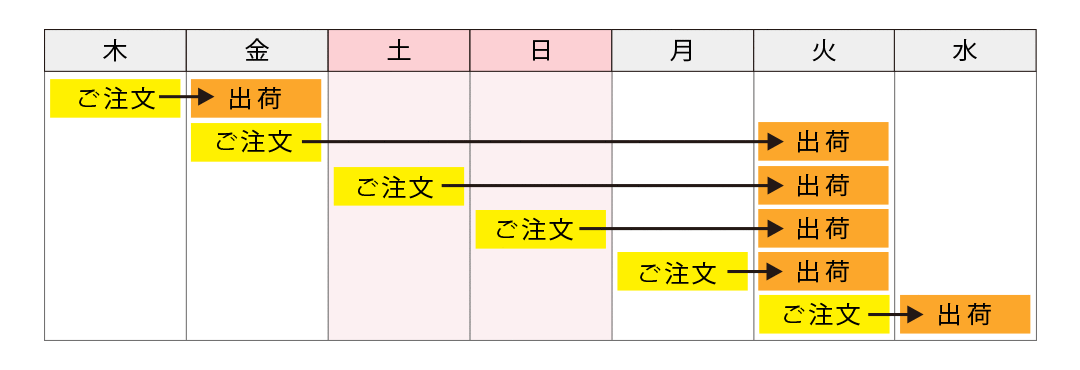 月曜~木曜の平日営業日の午前8時までにご注文完了したものが対象となります。 休日、祝日にご注文いただいた場合は、翌々営業日(2営業日)に出荷となります。 ※長期休業明け(GW、年末年始、夏季休業など)は、翌日に出荷ができない場合がございます。 例えば木曜の夜のご注文ですと金曜のご注文分となり月曜日出荷、火曜の朝7時のご注文ですと水曜出荷です。