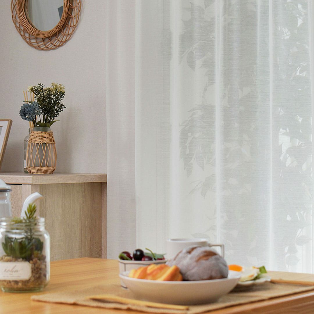 ▲写真の仕様は1.5倍ヒダ(プレミアム縫製+形状記憶)です 肌触りが柔らかで涼し気な優しい表情のレースカーテン。※写真は裾折り返しですが、この商品ページは裾ウエイトテープ仕上げになります。