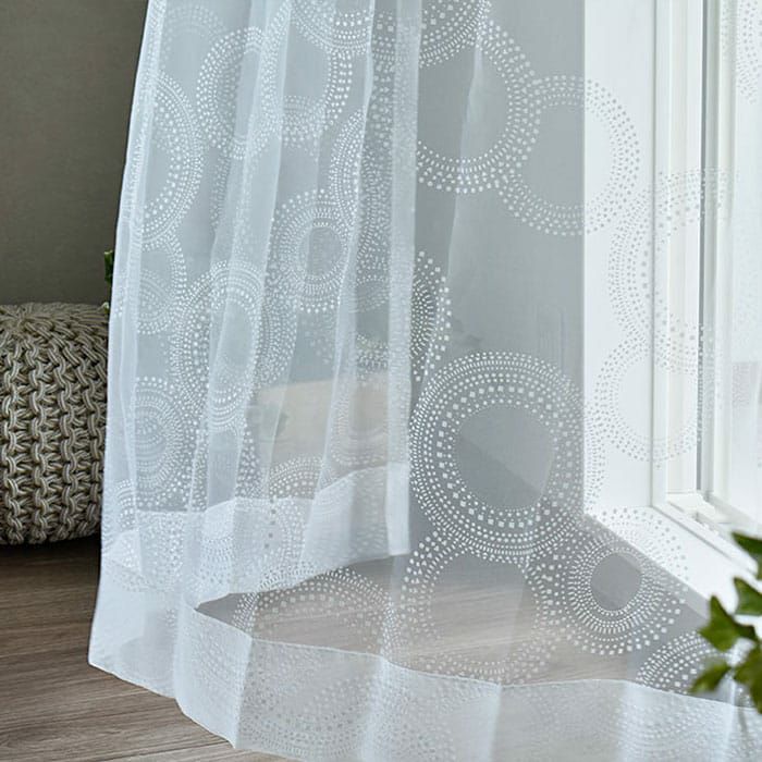生地全体に広がるバブル柄。透明感がありとっても軽やかです。 フロントレースにしても楽しめるレースカーテンです。