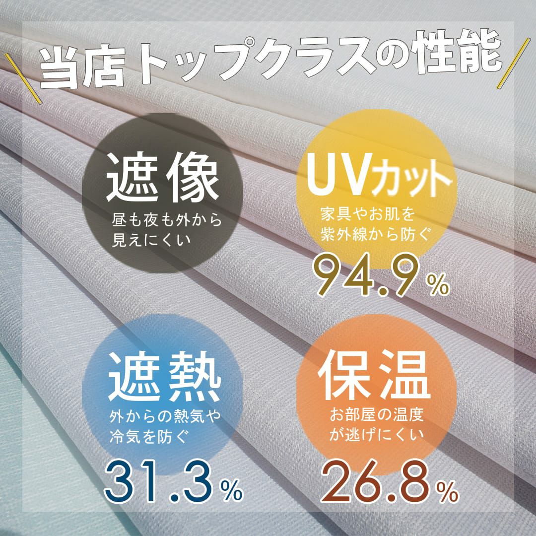※全て写真の仕様は1.5倍ヒダ(プレミアム縫製+形状記憶標準)です。 UVカット機能で紫外線対策、遮像・ミラー機能で 外からのプライバシーを守ってくれる優秀なレースカーテンです。 また、7色あるのでいろんなスタイルのお部屋に合わせて選べることができます。