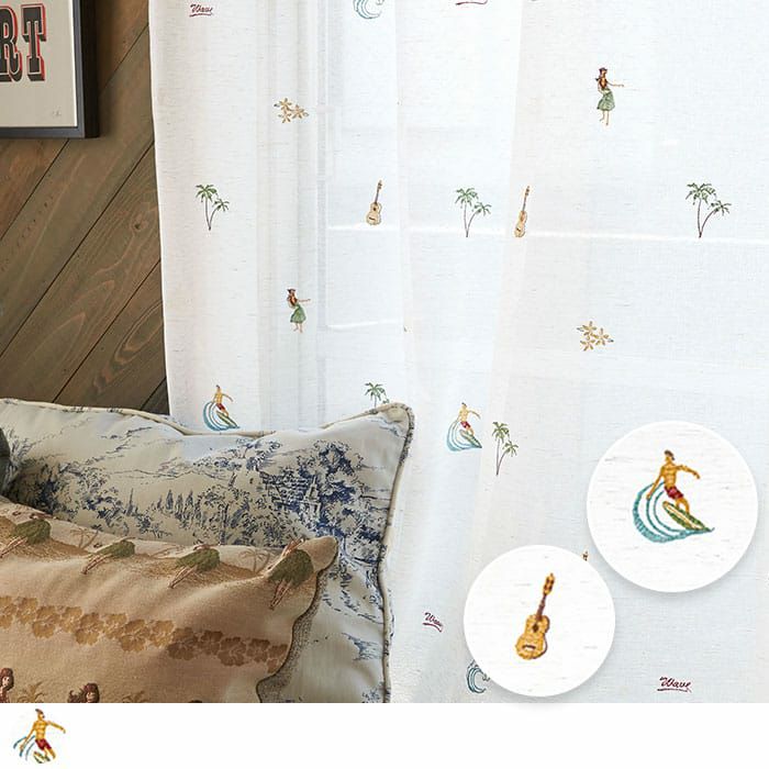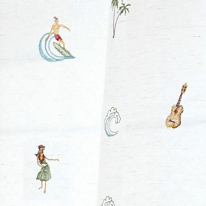 鎌倉に住むサーファーの方のリクエストで作った HAWAIモチーフがいっぱいの刺繍カーテンレースです。 窓の外に海を感じる涼しく楽しいレースカーテン。