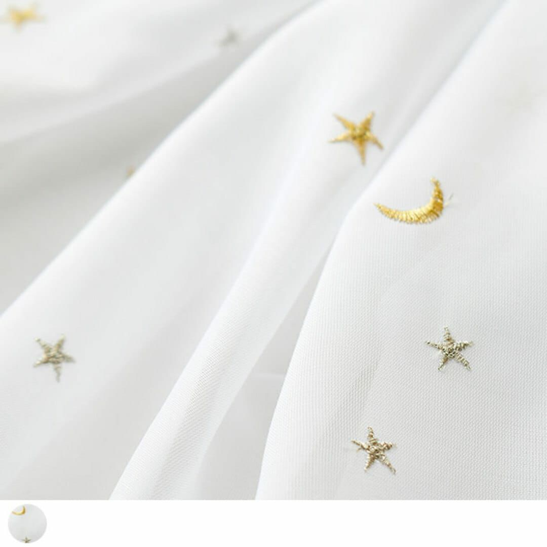 お星さまとお月さまが散ばるかわいいボイルレースカーテン。 シルバーとゴールドの刺繍がキラキラ輝いてとてもロマンチック。 ボイルレースだから風にふわりと揺れる軽やかなカーテンです。