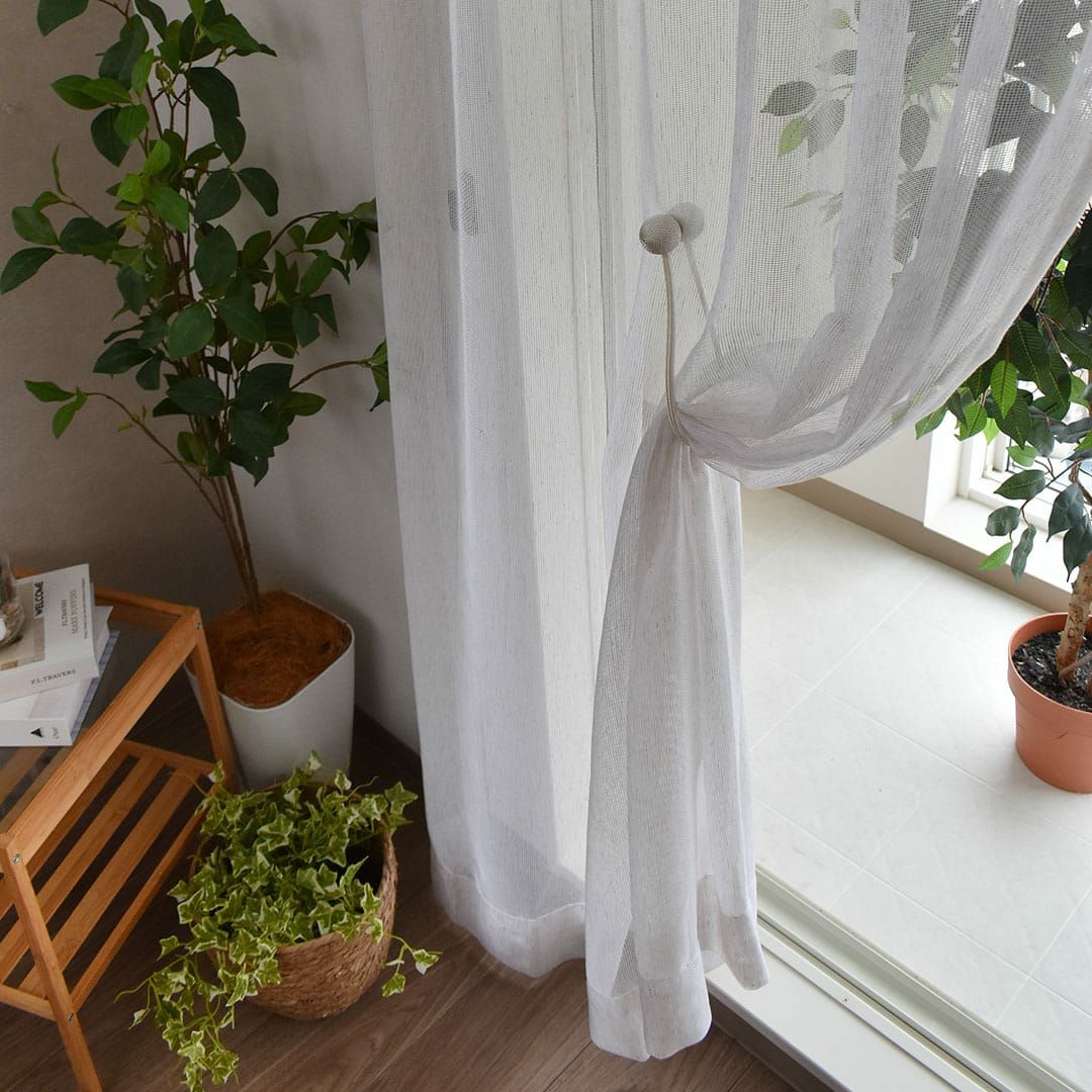 ※このページの写真のカーテンはすべて1.5倍ヒダです 柔らかいメッシュのような表情のレースカーテン。所々にイミテーションの綿ネップがプラスされているので、天然素材のように見えます。ポリエステル100%なのでお家でお洗濯も可能です。