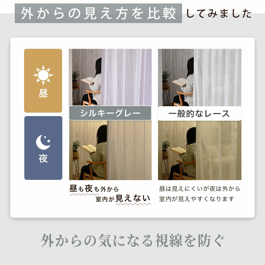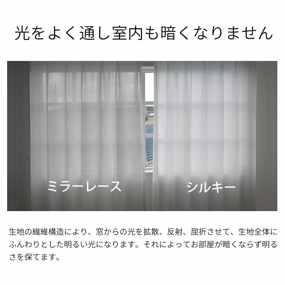 ミラーレースは昼は外からの様子が見えませんが夜になると透けてしまいます。しかしシルキーは夜も室内の様子がほとんど見えないので外の視線が気になりません。ご購入前にはサンプル生地を取り寄せて透け感や光の通り具合などを事前にチェックしすることをおすすめします。