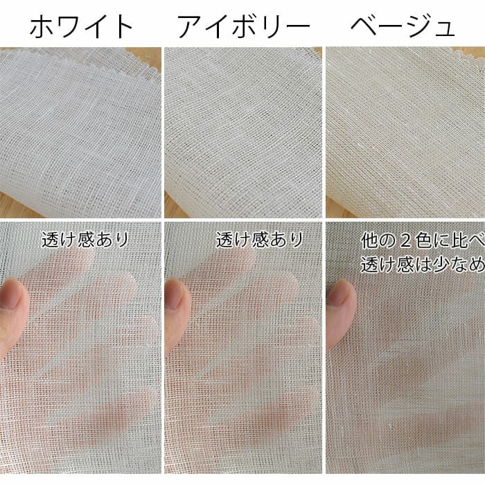 ホワイト、アイボリーは透け感のある生地ですが、ベージュは他の2色よりも透けにくい生地です。麻特有の生成り色のネップが織り地に入っています。天然素材感のある無地です。
