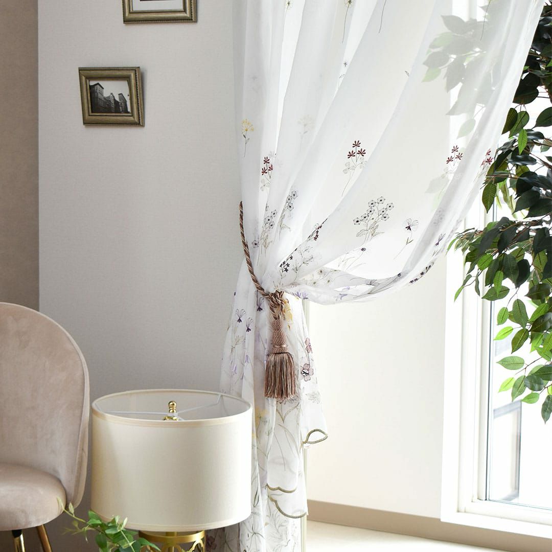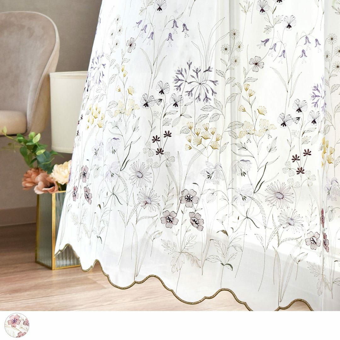 東洋と西洋が融合されたデザインのレースカーテンで、美しい透け感や繊細な刺繍が特徴です。小花柄の刺繍、美しい裾のスカラップ刺繍、スパンコール刺繍など多様でどれも美しく高級感があります。 刺繍を施したものだけでなく、縦ストライプや地模様などシンプル・ナチュラルな生地もあります。