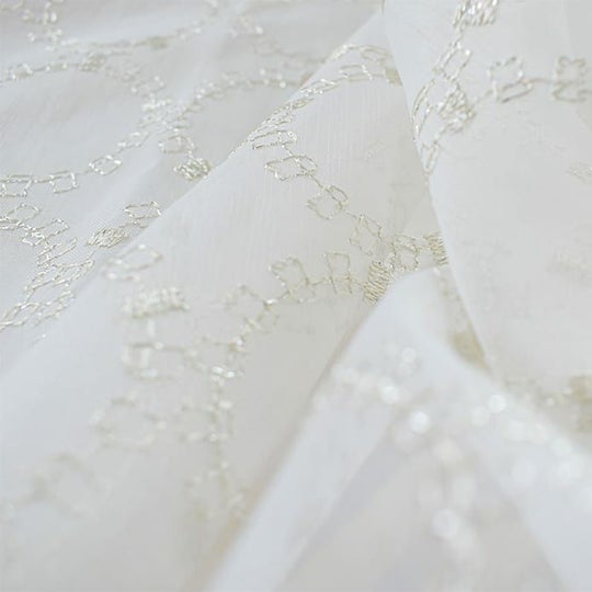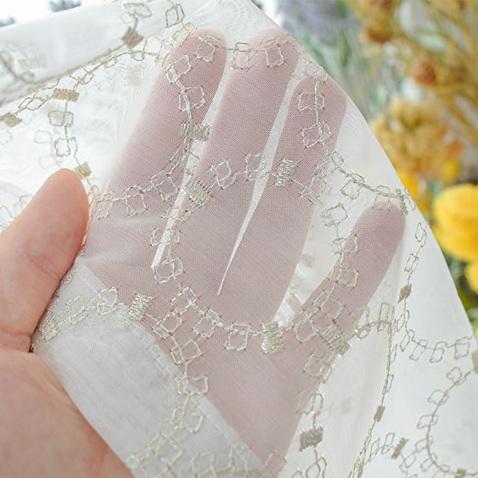 不思議なサークル柄の刺しゅうが施された特徴的なレースカーテン。 生地も光沢があり華やかな印象を与えます。 裾のスカラップにも同じ糸が使われていてよりきらびやかに。 お部屋をひときわ明るくしてくれます。