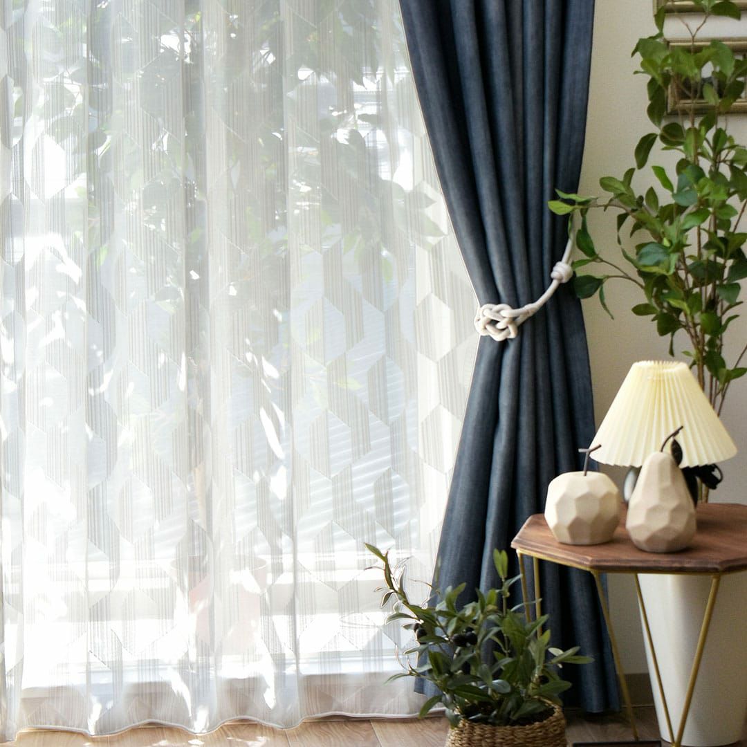 (▲使用アイテム:カーテン ディエゴ(ネイビー)、タッセル リンク(ホワイト)) 台形を組み合わせた幾何学模様が連なり、おしゃれでモダンな雰囲気です。 洗練されたデザインは北欧インテリアにも良く合います。 ※写真は全て2倍ヒダです。