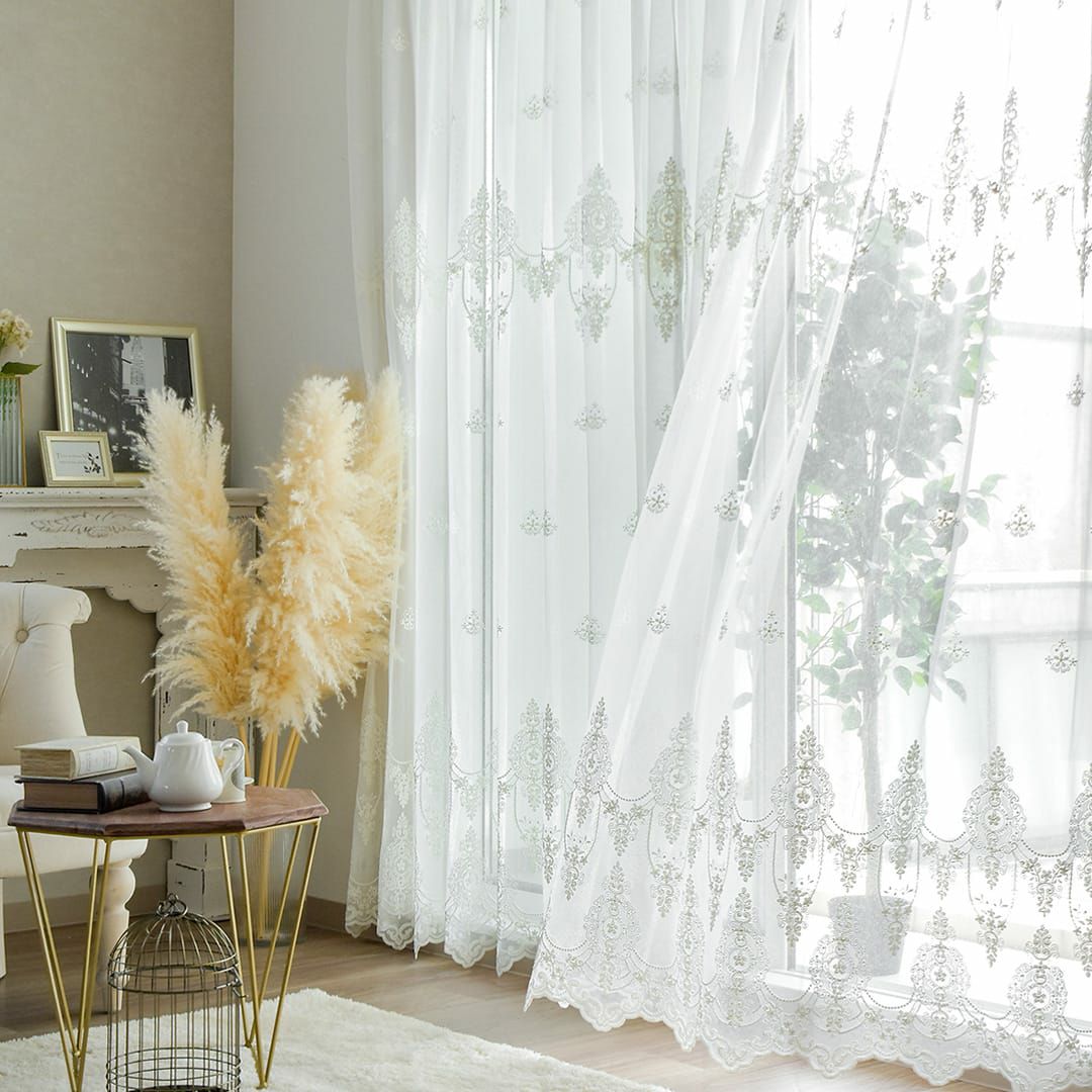 ※すべての写真は2倍ヒダです。 スカラップ仕立ての裾と 繊細で立体的な刺繍が美しいトルコ刺繍レースカーテン。 アンティーク感のあるクラシックなデザインで お部屋をワンランク上の印象へ! おしゃれで凝ったデザインは リビングや寝室だけでなく おもてなしの空間にも。 美しい透け感も魅力です。 風になびいた時も軽やかさにうっとり♪