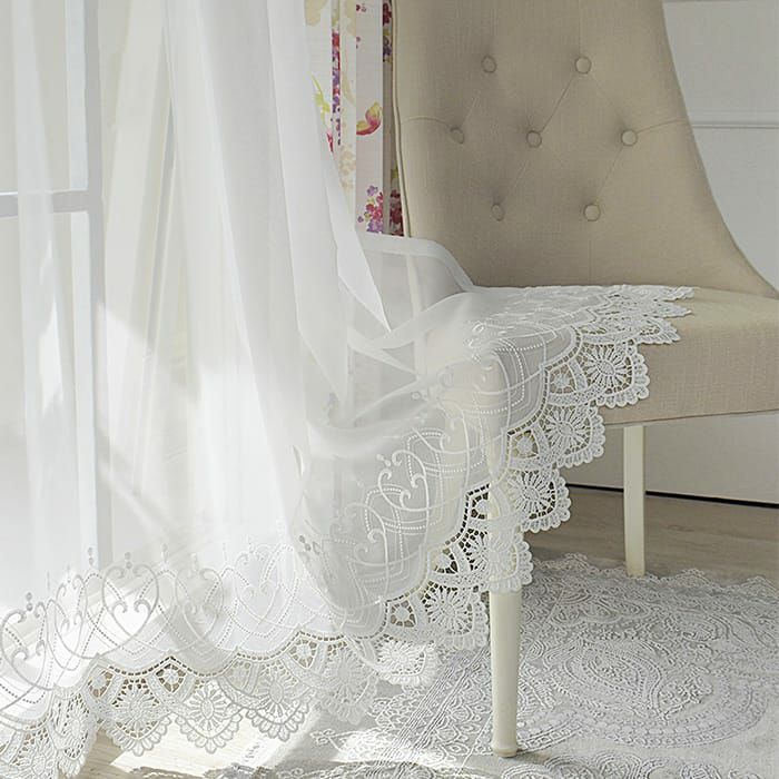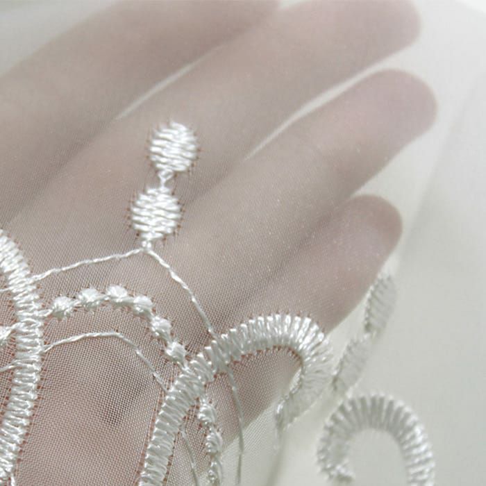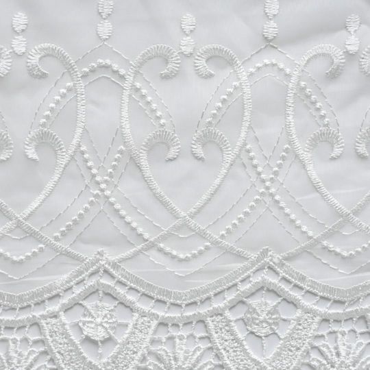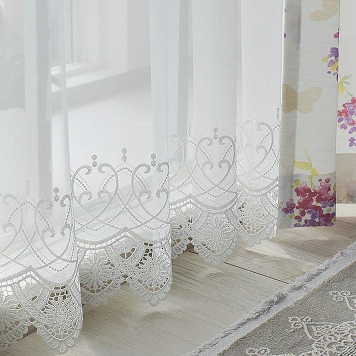 裾にたっぷりと施された、曲線が美しいゴージャスな刺繍です。穢れのない無垢な印象のレースカーテンです。ほどよい透け感の生地で上品で開放感がある空間に。