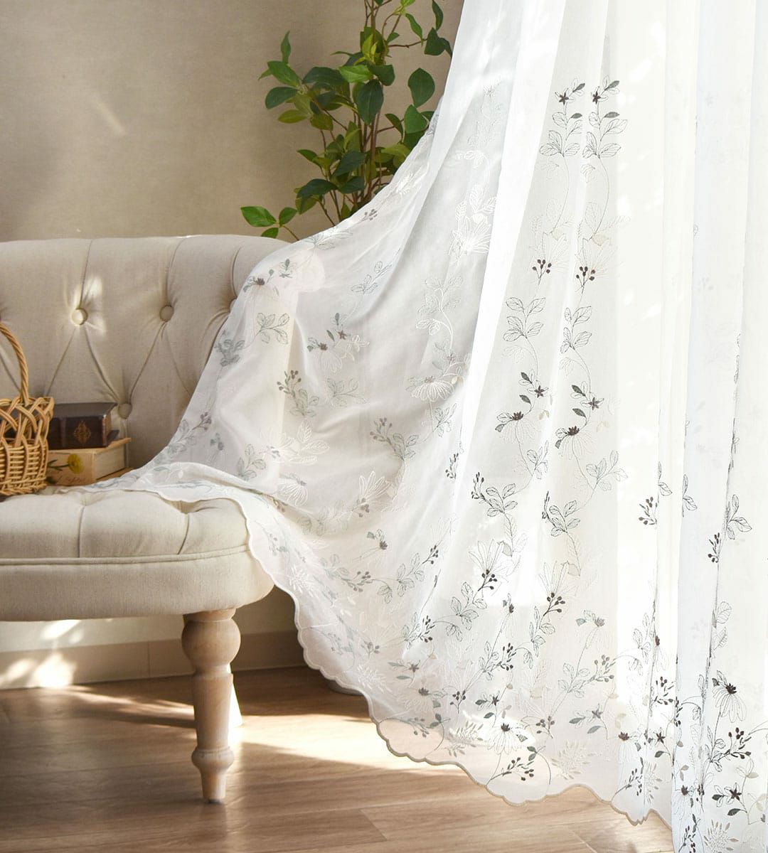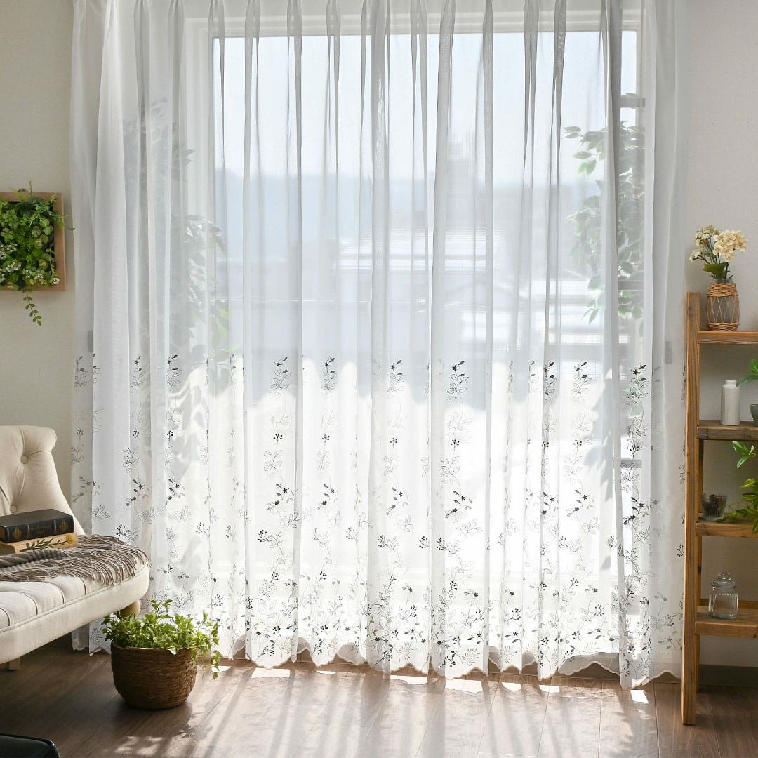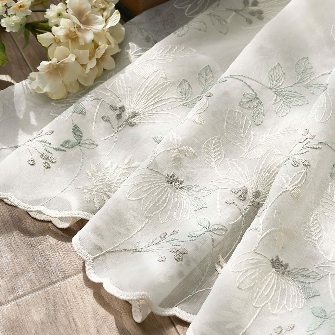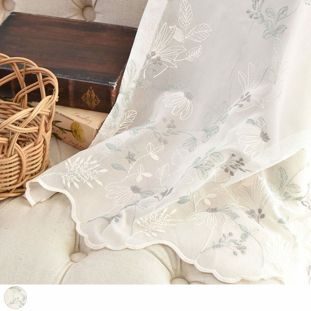 ふんわりと透け感のあるレースに柔らかな色味の糸で繊細に刺繍されたボタニカルデザインです。 のどかなお散歩道で出会った草花のようで優しい気持ちに。 ナチュラルな雰囲気で北欧インテリアにも良く合います。 日差しが当たるとお部屋の中に映る柄が美しく幻想的です。 ※写真のカーテンはすべて2倍ヒダです