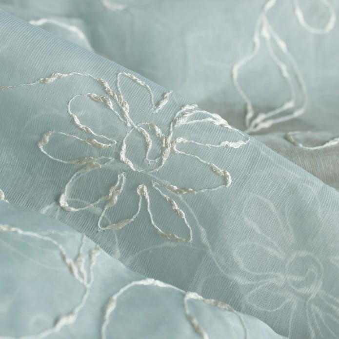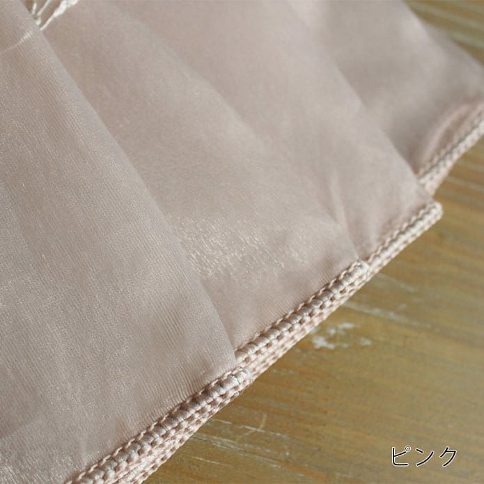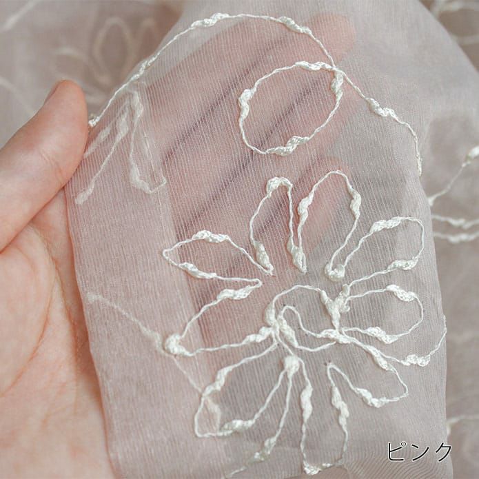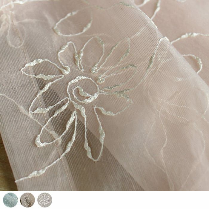さらりとした生地に光沢のある糸で 全面に刺繍されたかわいい花柄♪ 裾はウエイトテープ仕上げですっきりと。