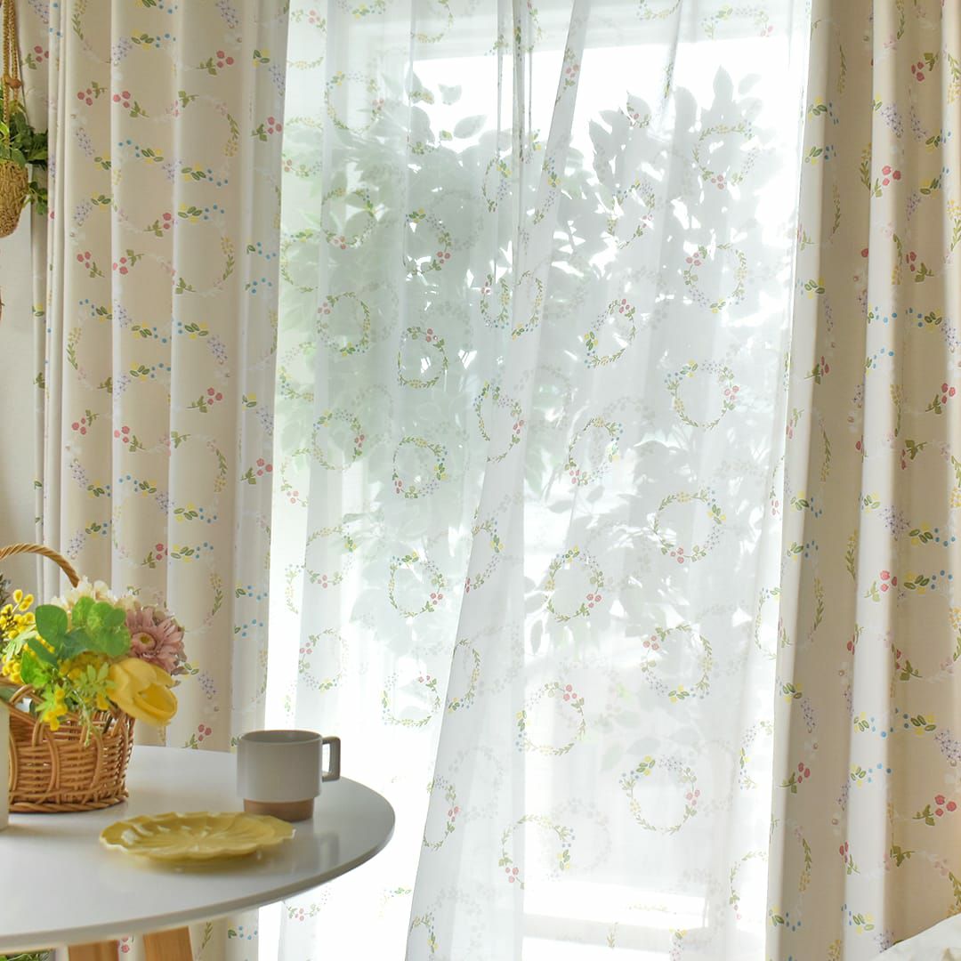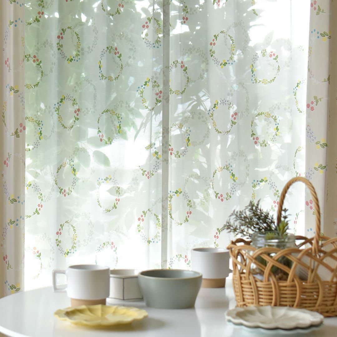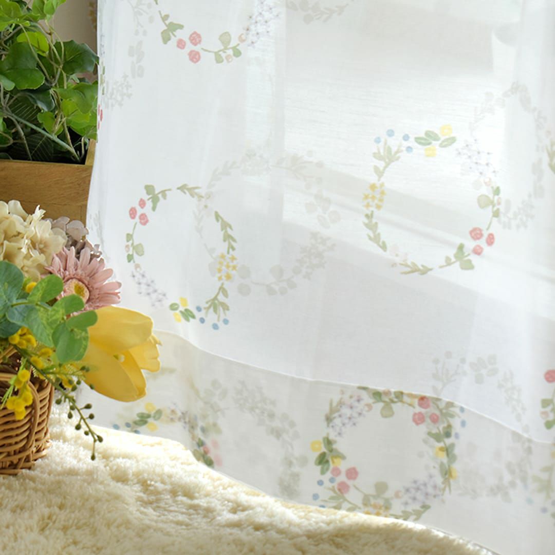 レース生地に、四季の野花を束ねたブーケをプリントしたレースカーテン。 手描き風のデザインと丸いモチーフで優しい印象を与えます。 ナチュラルテイストにぴったりです。 ※写真はすべて1.5倍ヒダ+プレミアム縫製+形状記憶加工です。