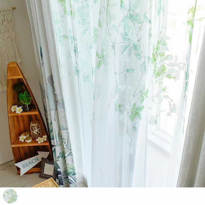 開放感のあるボタニカルデザインでお部屋がまるでリゾートに!とっても爽やかで涼しげなレースカーテンです。 さらっとしたほどよい透明感のボイルレース生地でお部屋から外の景色が見えます。 リビング、寝室などにおすすめ!ボタニカル柄カーテンで一年中緑をお部屋で楽しみましょう。