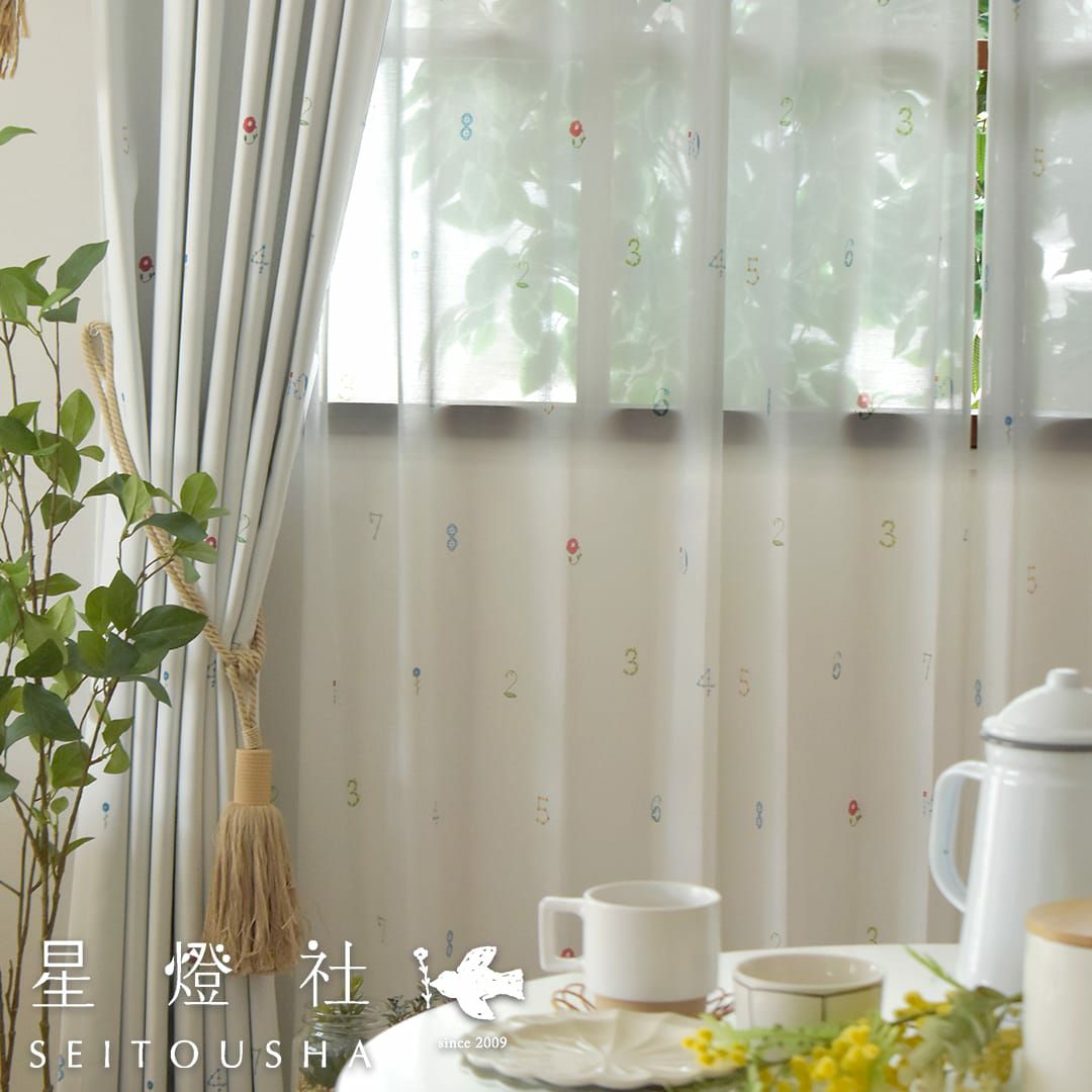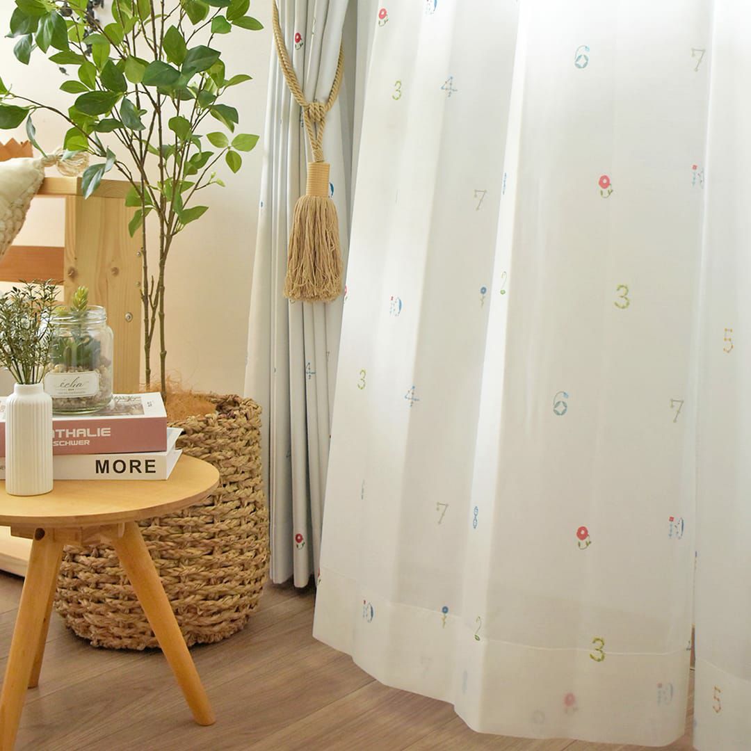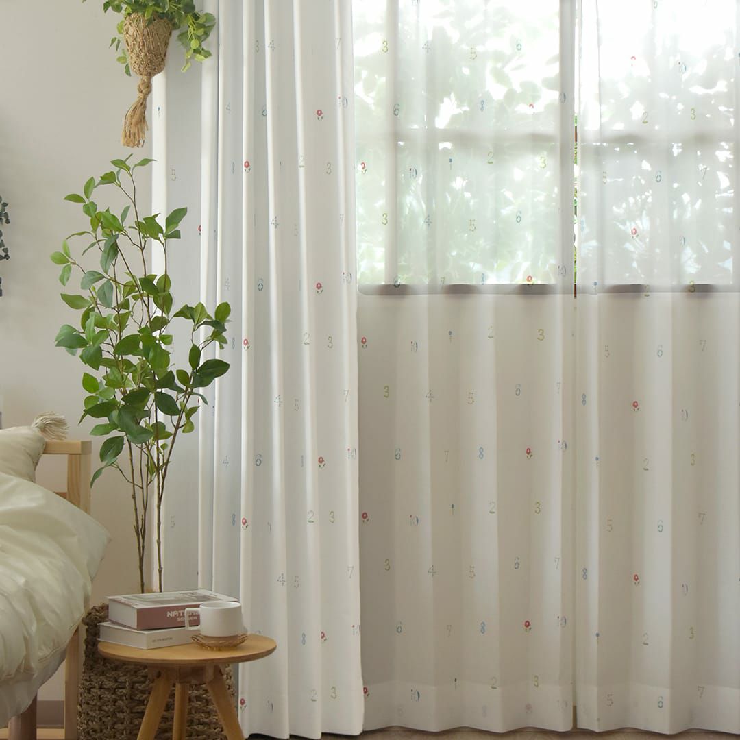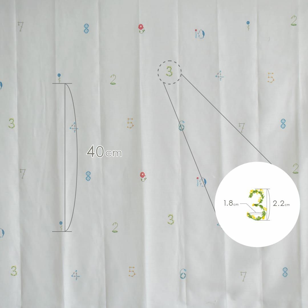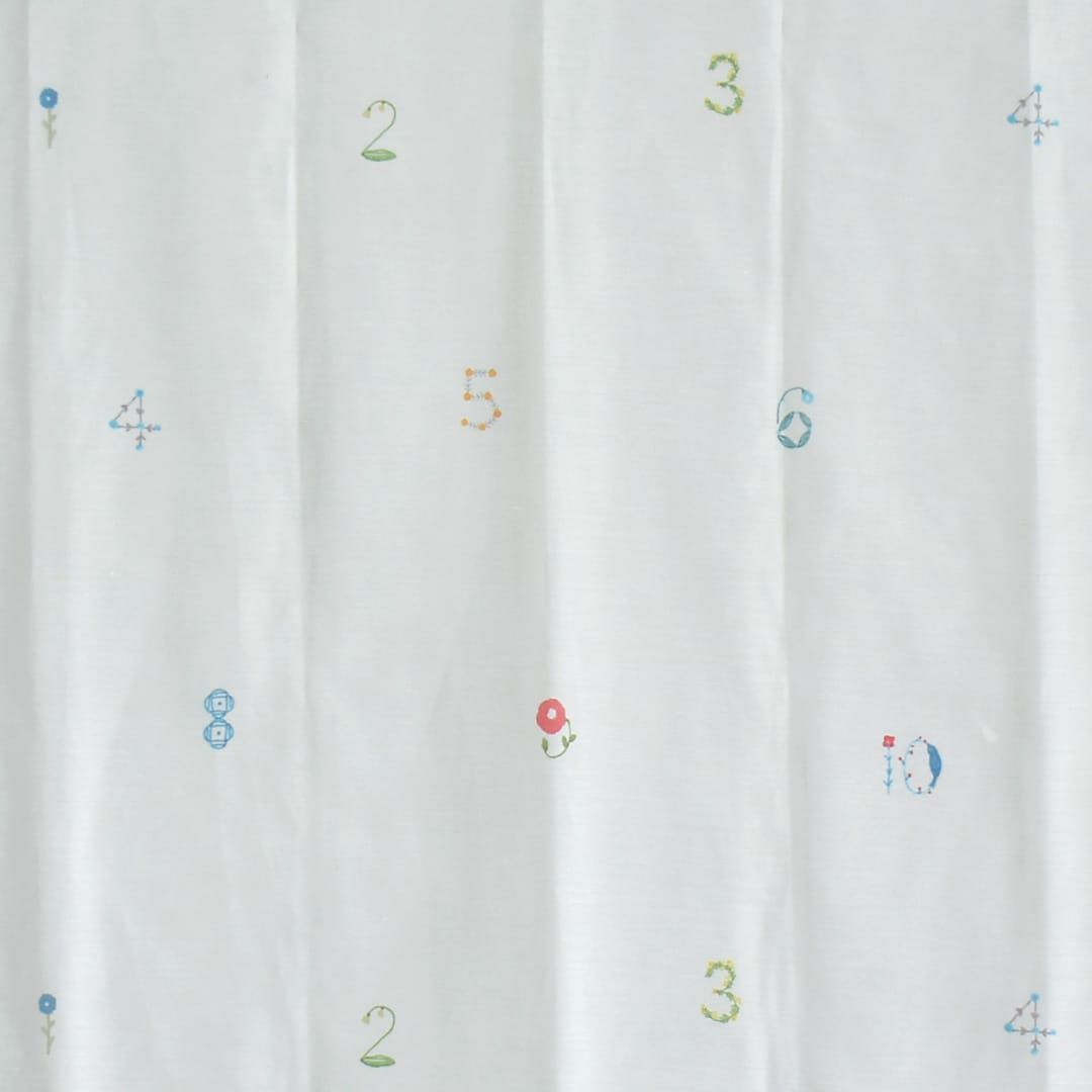 レース生地に1から10の数字を草花で描いた3級遮光カーテン 数字のどこかに小鳥が隠れています♪