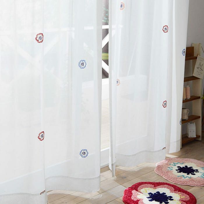 パンジーの花の刺繍が可憐で優しげな北欧風ボイルレースカーテン。無地のボイル生地に赤、ピンク、ブルーの大きめの花の刺繍が印象的なシンプルデザインレースカーテン。
