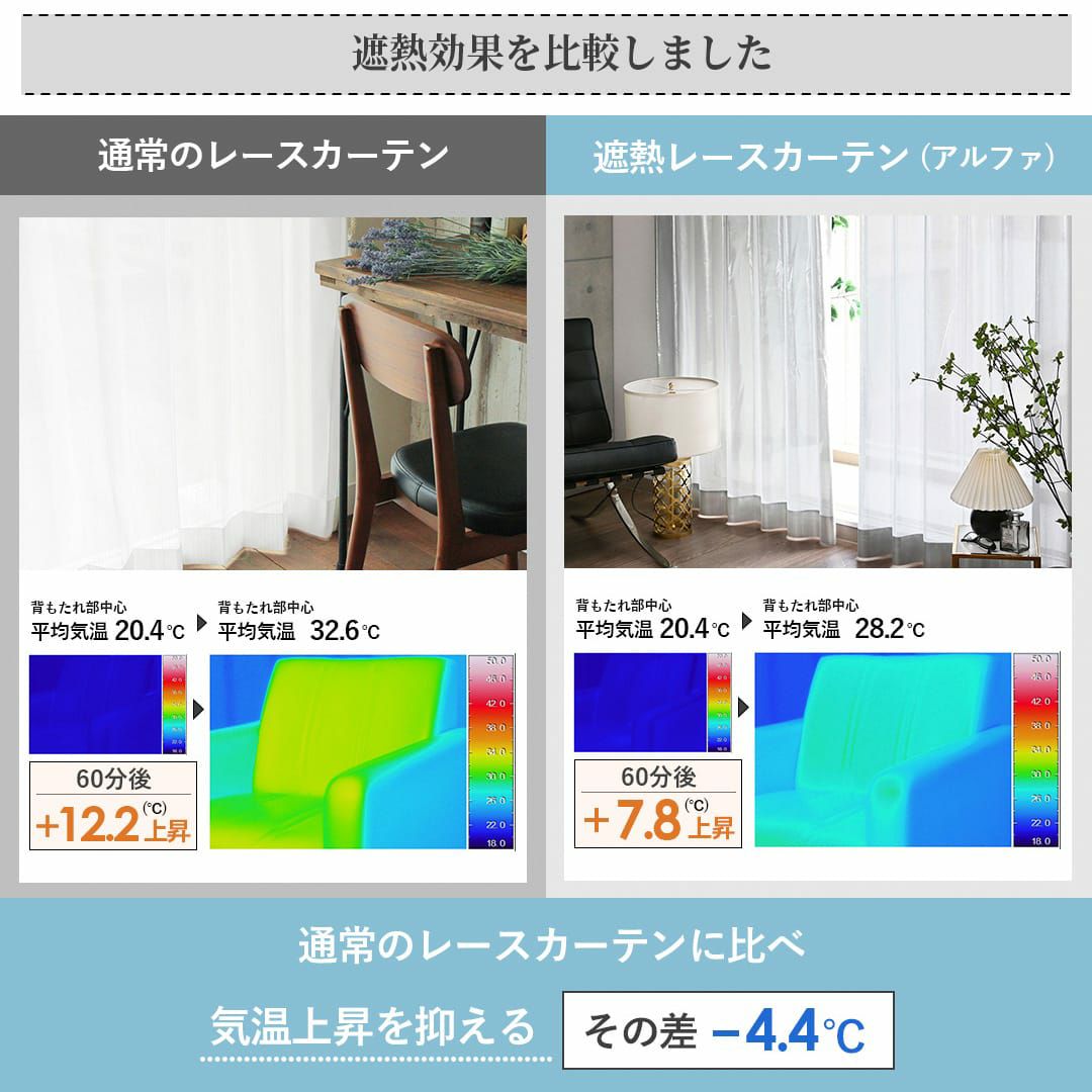 この試験で得られる「保温効果率」は、カーテンが室内温度の下降をどれだけ抑えられるかを示す指標です。比較の結果、「アルファ」は4.3℃温度低下を抑えていることがわかります。