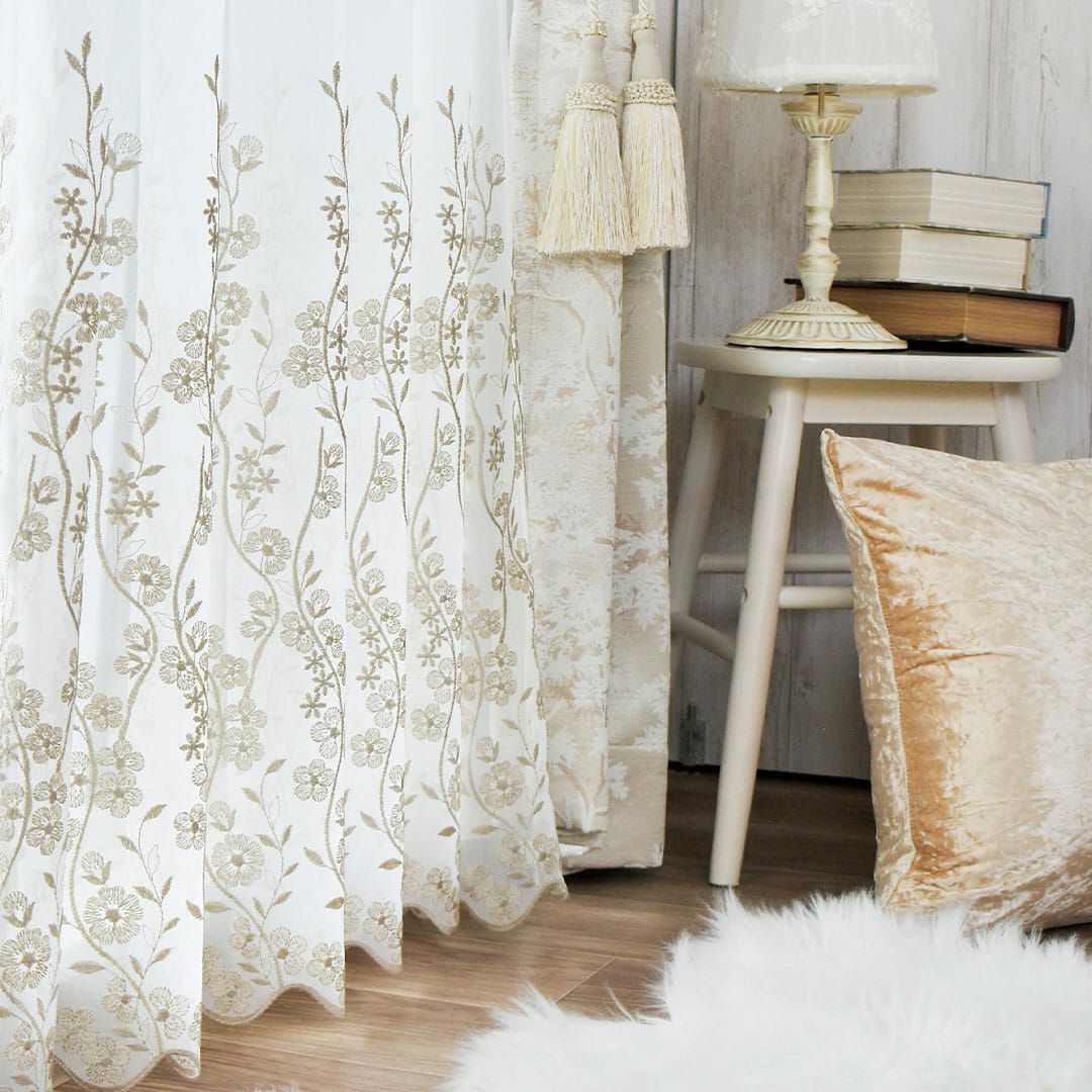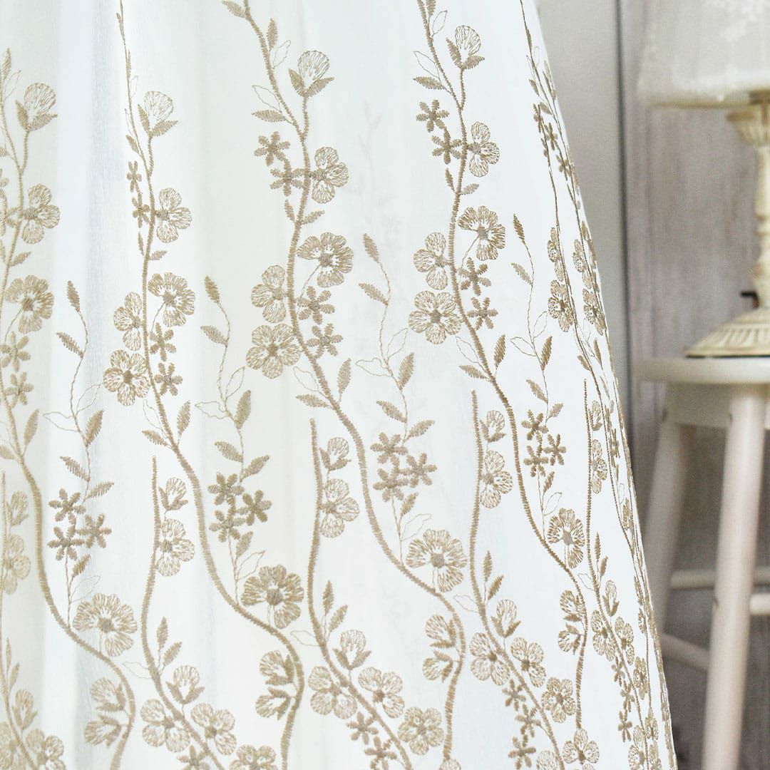 (▲使用アイテム:タッセル ふたさらさら(ホワイト)) 贅沢に施されたボタニカルデザイン刺繍トルコレースカーテンです。 ドライタッチな質感のシャンパンゴールドの刺繍糸で、甘すぎないエレガントな空間に。 シームレスだから継ぎ目がなく美しい仕上がりです。 ※全ての写真の仕様は2倍ヒダです。