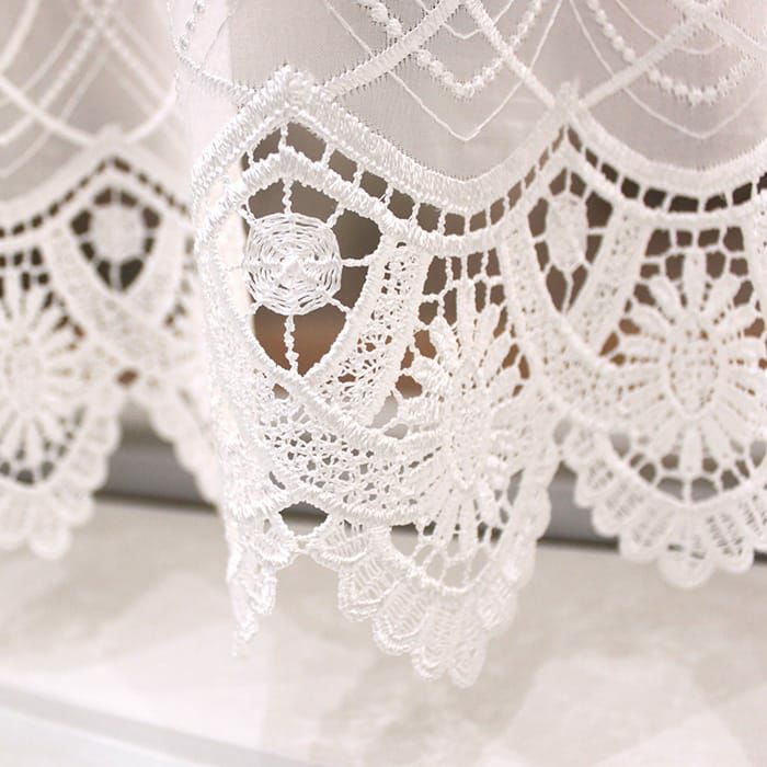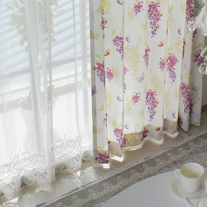 裾にたっぷりと施された、曲線が美しいゴージャスな刺繍です。穢れのない無垢な印象のレースカーテンです。ほどよい透け感の生地で上品で開放感がある空間に。