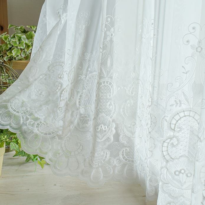 ※このページの写真のカーテンはすべて1.5倍ヒダです。 花柄の刺繍が上品さの中に可愛らしさをプラスしています! スカラップ仕上げの裾なのでエレガントで優美な雰囲気があります。 白い刺繍と白いレース生地なので お部屋を広く、美しくみせます! エレガントな雰囲気のお部屋にピッタリです。