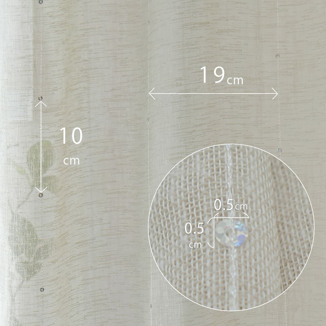 縦のラインに小さなスパンコールが等間隔で並べられたリネン風レースカーテン。 カラーはくすみカラーのアイボリーで、明るいけれど落ち着いた空間になります。