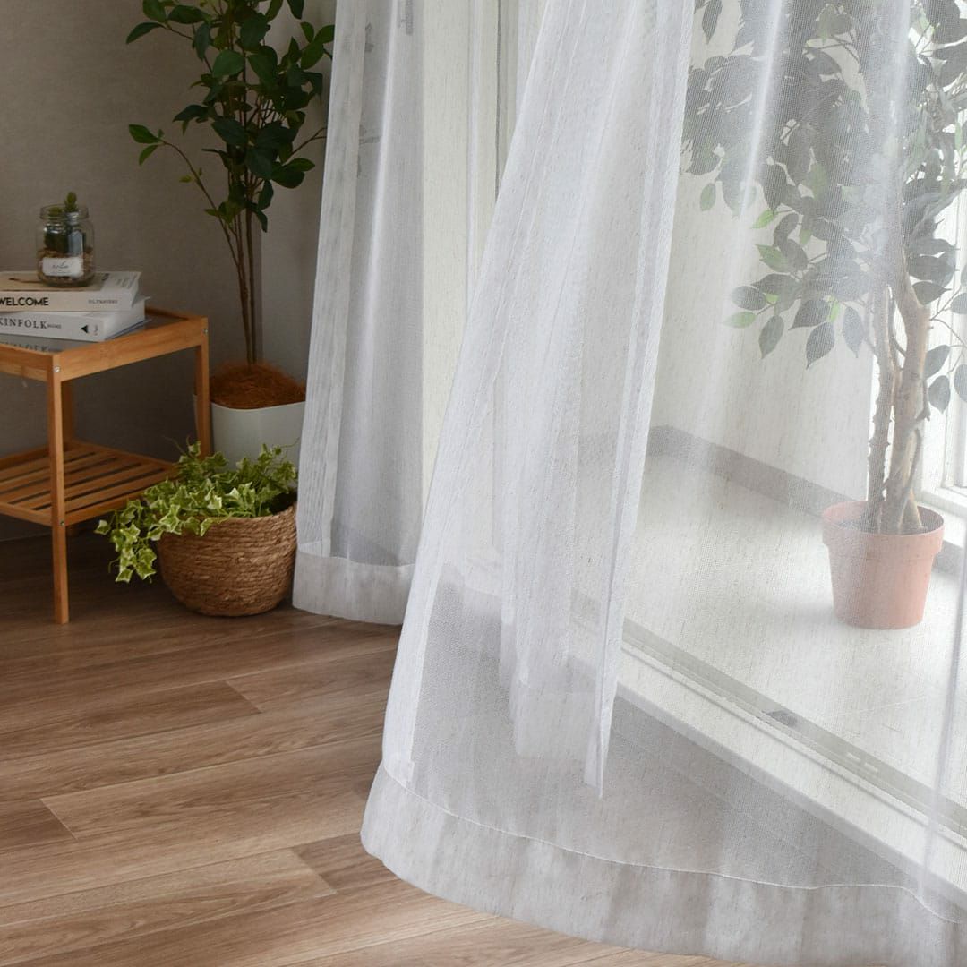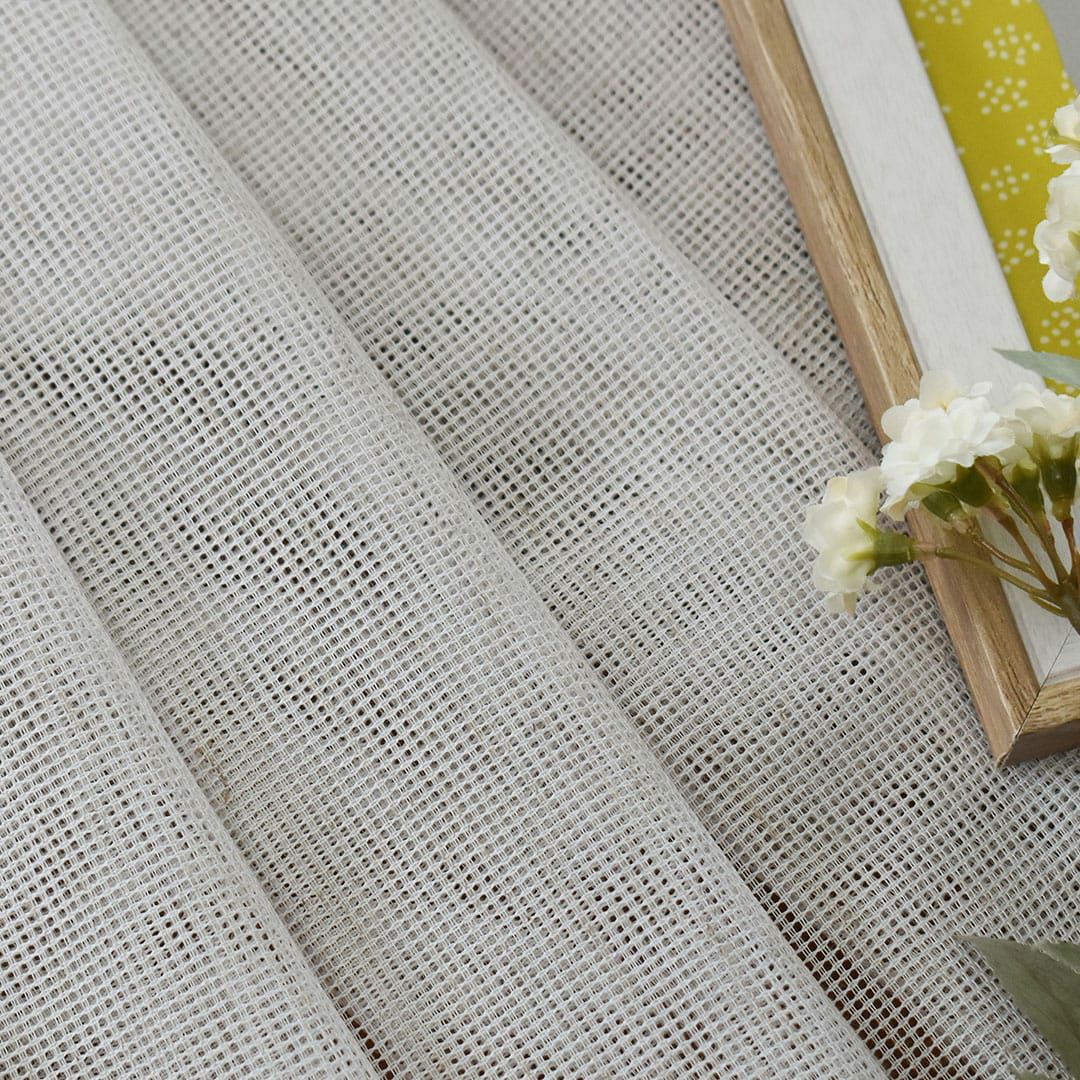 ※このページの写真のカーテンはすべて1.5倍ヒダです 柔らかいメッシュのような表情のレースカーテン。所々にイミテーションの綿ネップがプラスされているので、天然素材のように見えます。ポリエステル100%なのでお家でお洗濯も可能です。