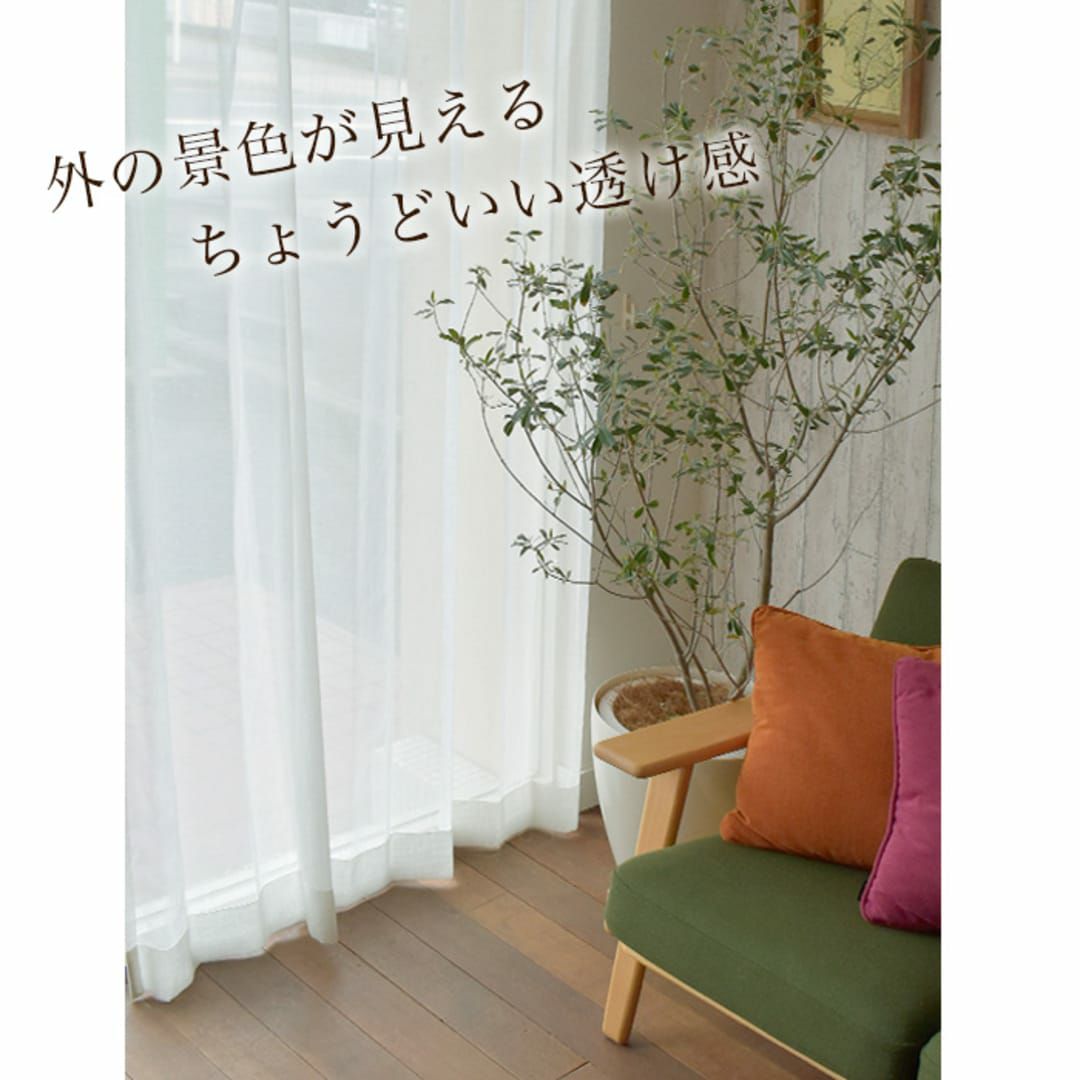シャリ感があり麻のようなナチュラルな生地感、シンプルデザインの防炎レースカーテンです。 ※写真は全て1.5倍ヒダ(形状記憶あり)です。