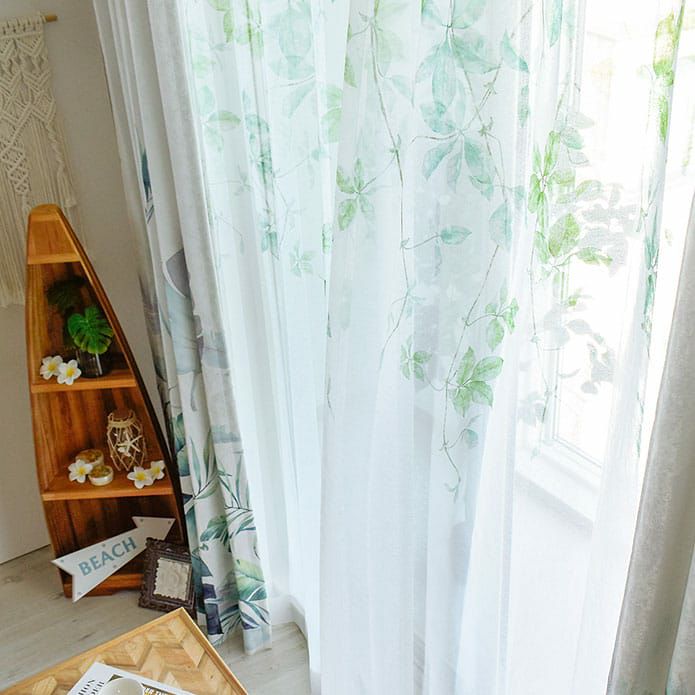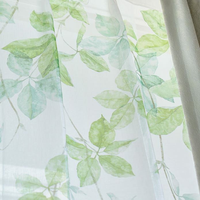 開放感のあるボタニカルデザインでお部屋がまるでリゾートに!とっても爽やかで涼しげなレースカーテンです。 さらっとしたほどよい透明感のボイルレース生地でお部屋から外の景色が見えます。 リビング、寝室などにおすすめ!ボタニカル柄カーテンで一年中緑をお部屋で楽しみましょう。