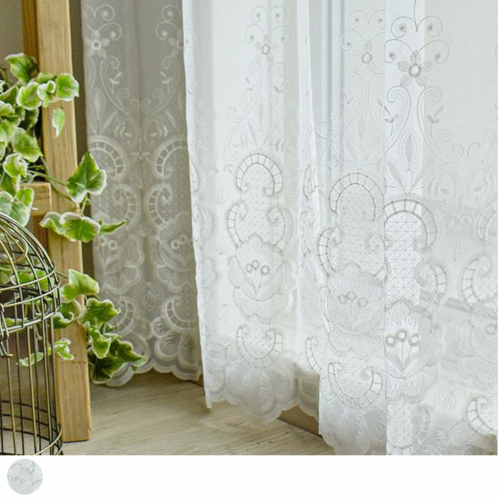 ※このページの写真のカーテンはすべて1.5倍ヒダです。 花柄の刺繍が上品さの中に可愛らしさをプラスしています! スカラップ仕上げの裾なのでエレガントで優美な雰囲気があります。 白い刺繍と白いレース生地なので お部屋を広く、美しくみせます! エレガントな雰囲気のお部屋にピッタリです。