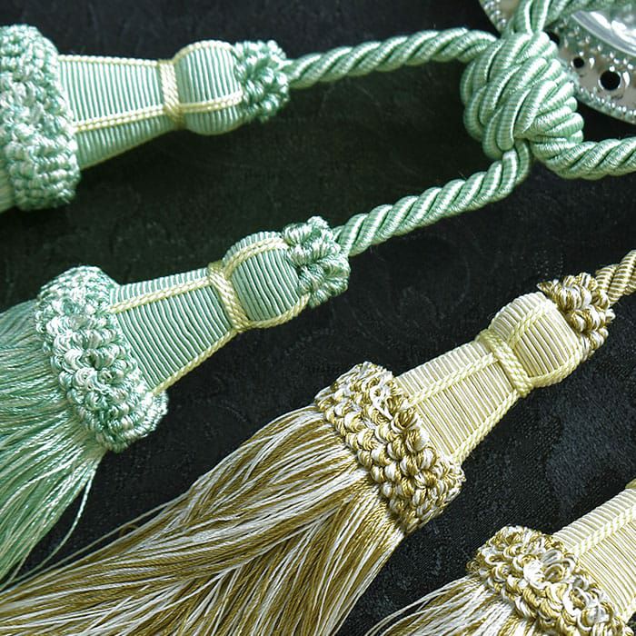 光沢のある紐と房上部のステッチが上品で重厚感のあるデザインです。